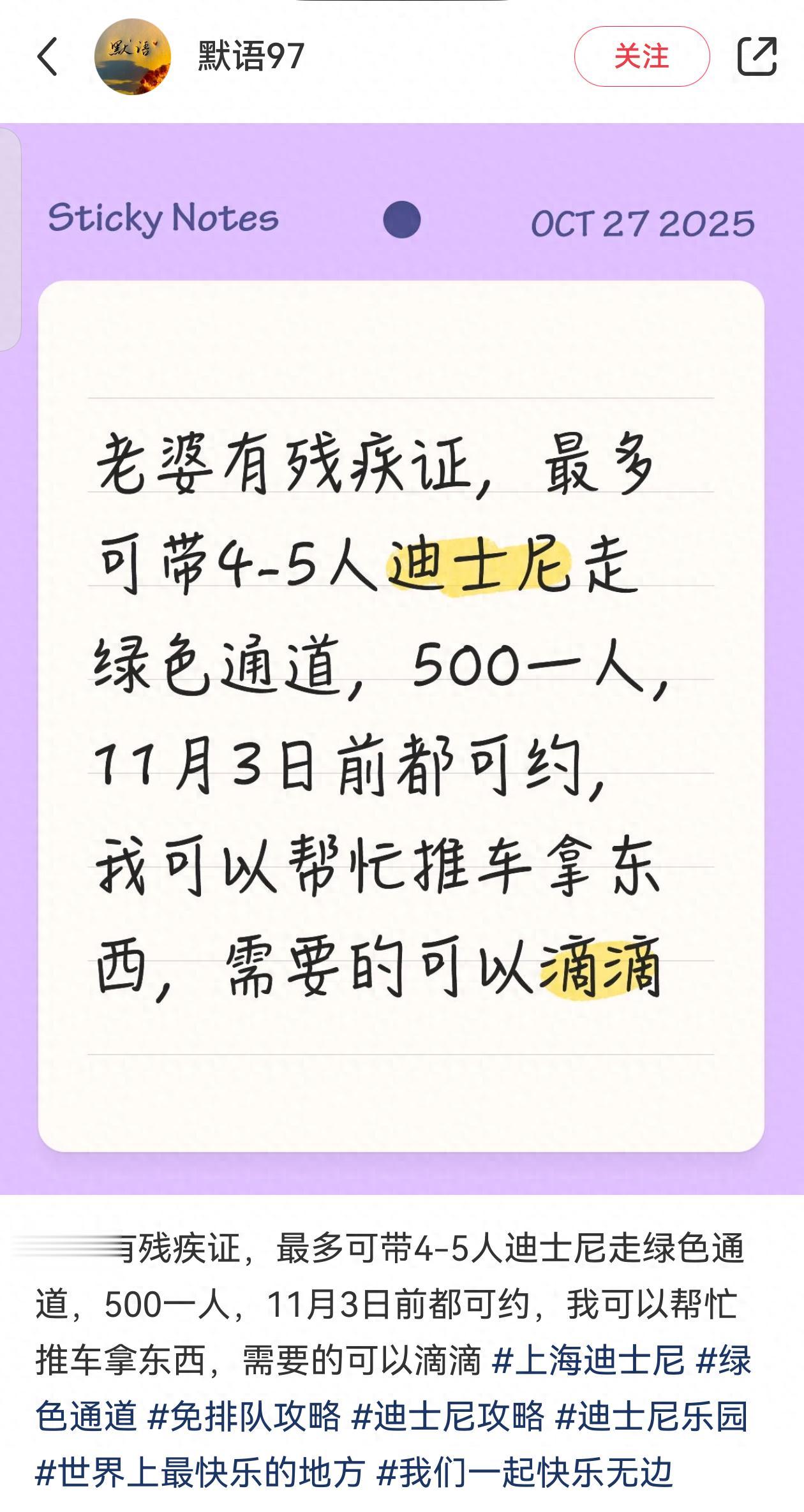 “残障人士通行服务册,280元起一位,5人成团,玩到闭园都行,小窗咨询详情。”