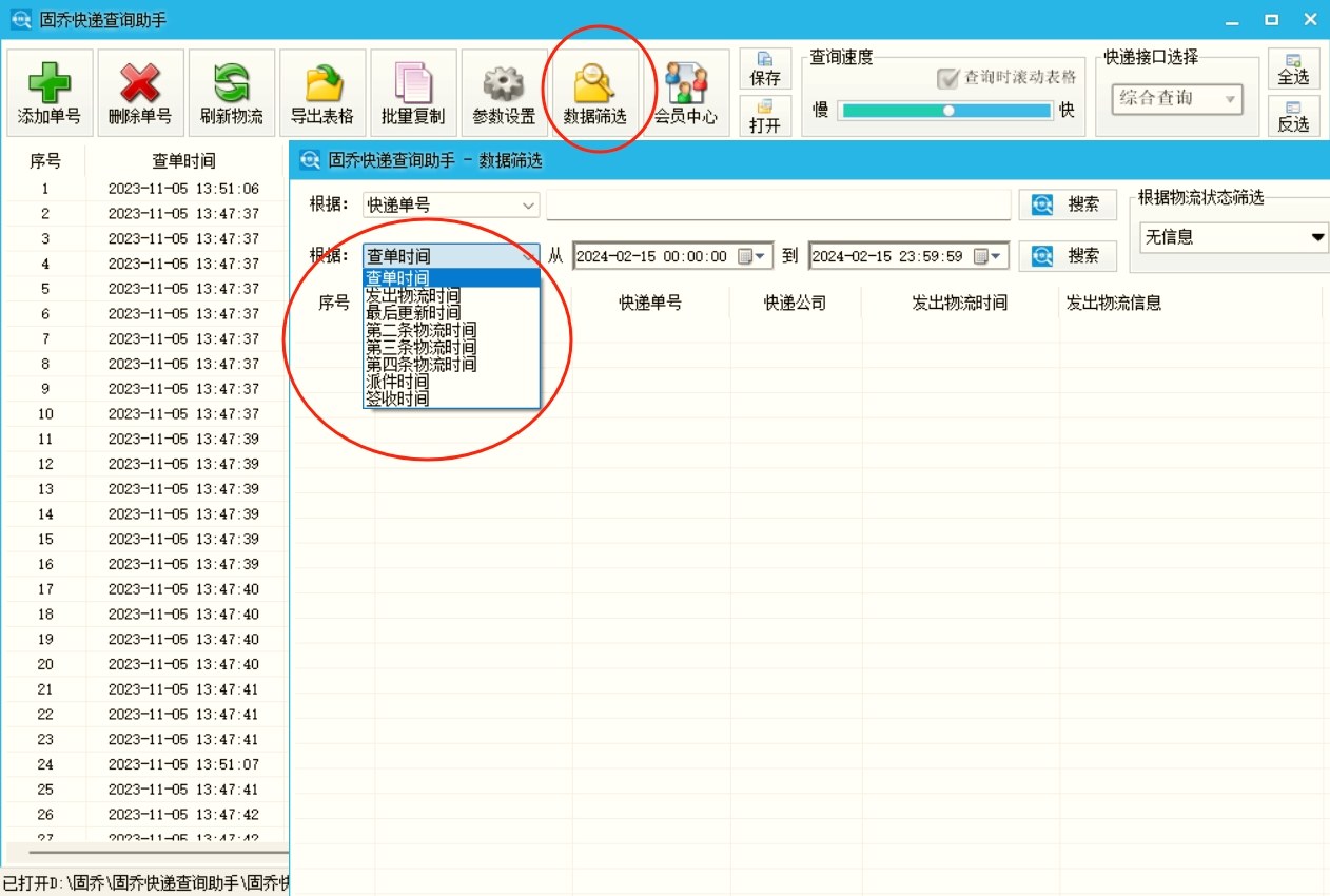数据筛选:支持单号、快递公司、物流状态、超时情况等8类条件组合筛选;