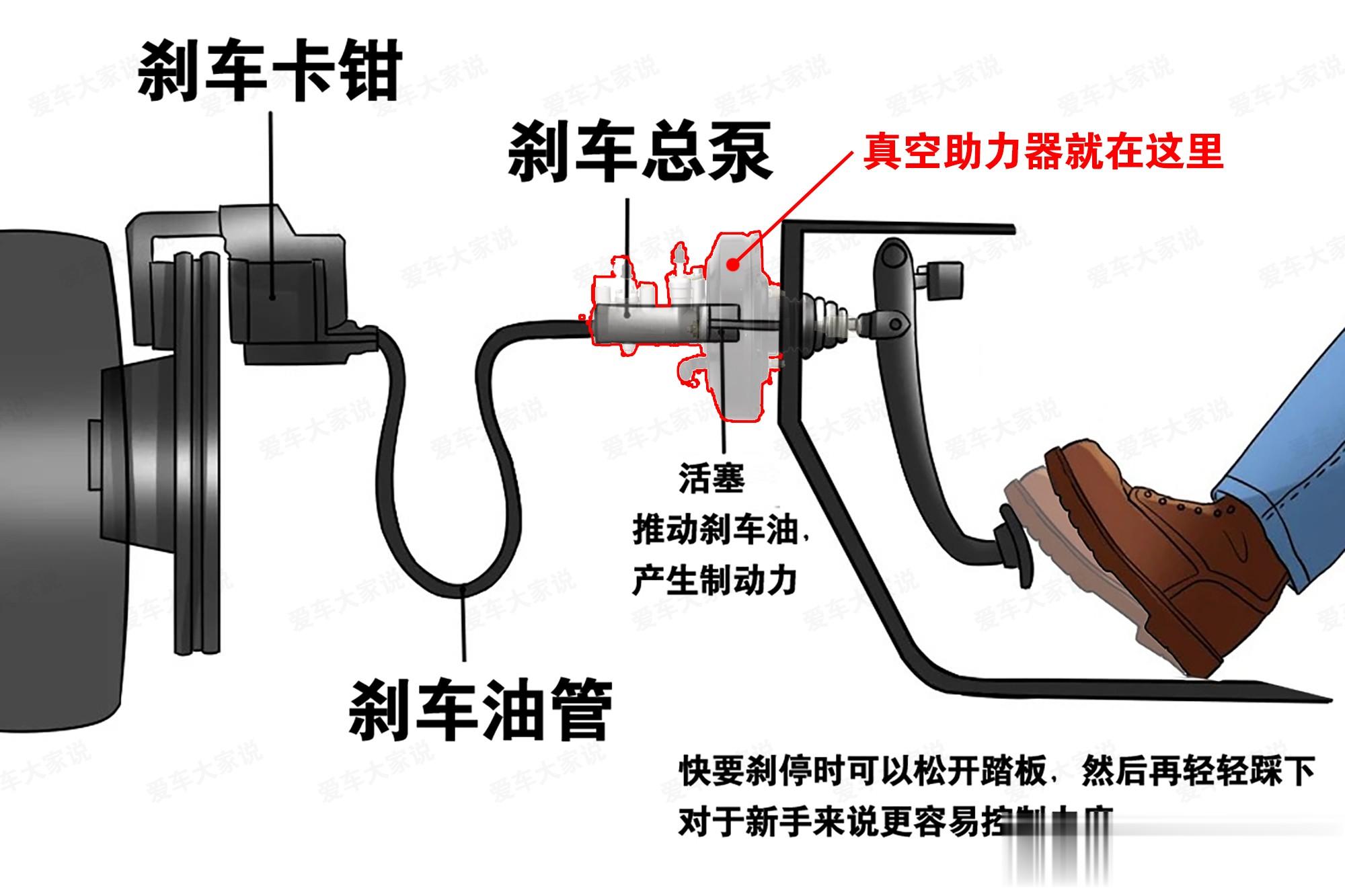 对于家用车,你可以想象这样的结构:刹车踏板后面是一个小注射器,四个车轮上各有一个大注射器,它们之间靠刹车管连着,刹车管和注射器里头都充满了刹车油。当你踩刹车的时候,刹车踏板驱动小注射器去推刹车油,刹车油再推动四个车轮的大注射器,再由大注射器推动刹车片去夹紧刹车盘,汽车就可以刹车了。