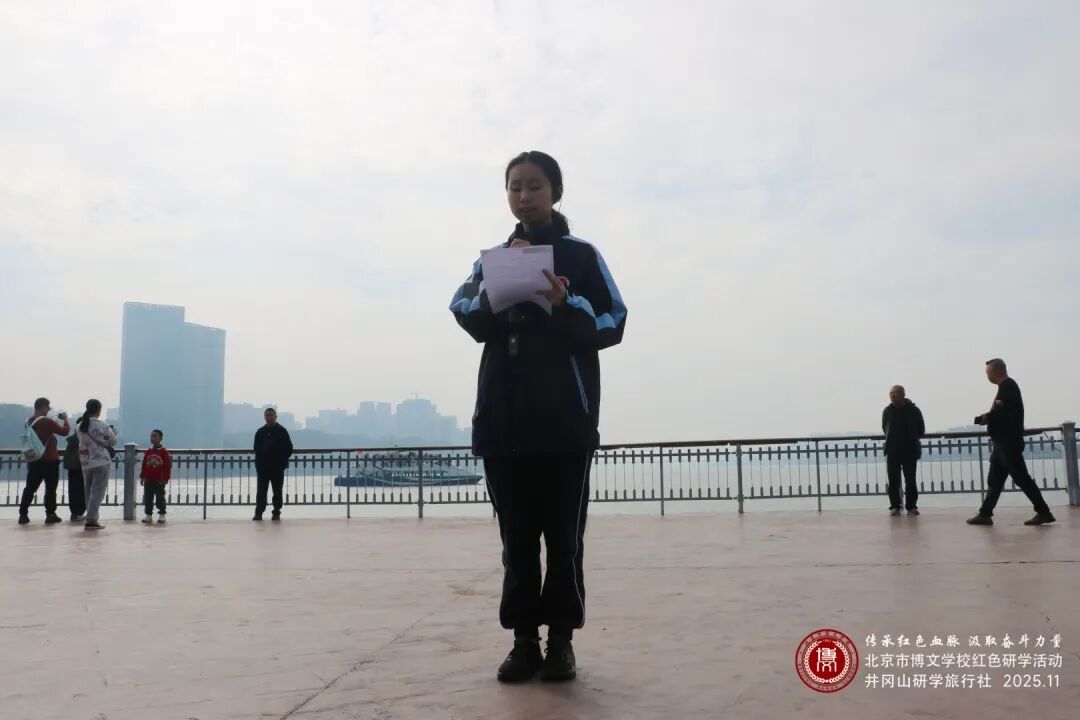 仪式尾声,全体学子列队肃立,面向滔滔北去的湘江,齐声朗诵《沁园春·长沙》。“万山红遍,层林尽染;漫江碧透,百舸争流”,激昂的诵读声与江水涛声交织共鸣,穿越百年时空与伟人的青春豪情相撞;“恰同学少年,风华正茂;书生意气,挥斥方遒”,稚嫩却坚定的声音里,饱含着博文学子对红色精神的敬畏、对青春使命的领悟。朗诵声中,学子们举起相机定格合影,让这一刻的感动与坚定,成为研学路上最珍贵的纪念。