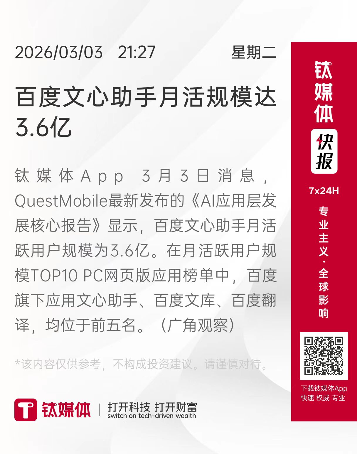 春节刚过,当大家还在回味红包抢了多少时,AI战场的一场“闪电战”已经悄悄分出了胜负。3月3日,QuestMobile的报告让不少人有些意外:百度文心助手月活跃用户规模直接冲到了3.6亿,稳稳坐在了行业第一的位置!
