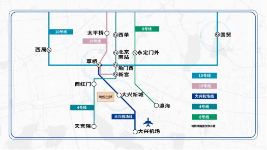 项目坐拥轨道交通核心优势:距大兴新城站约200米,真正实现 “出家门即入地铁”。从该站点出发,向北一站直达草桥站,可换乘10号线快速通达国贸、丽泽商务区,或换19号线抵达金融街等核心区域;向南一站直抵大兴机场,实现 “国门通勤” 无缝对接,尽享 “一站到草桥,换乘通达全城” 的 “一站三环” 通勤便利。