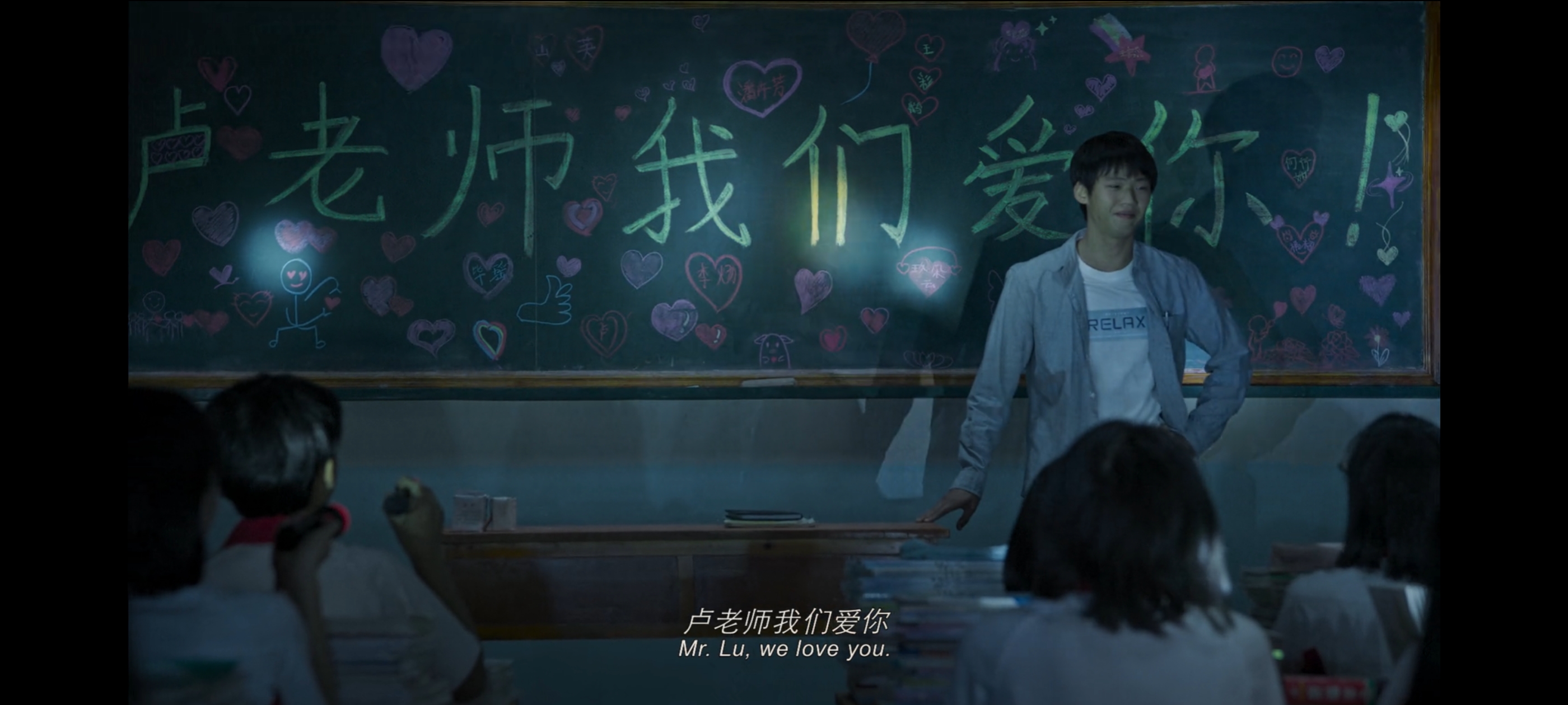 得知自己的卢老师女友嫁人,这群女孩子在黑板上写上:卢老师我们爱你,并画了很多小心心,满满的爱,望着眼前闪烁的手电筒,卢老师不由想起与徐影影甜蜜忧伤的过往。