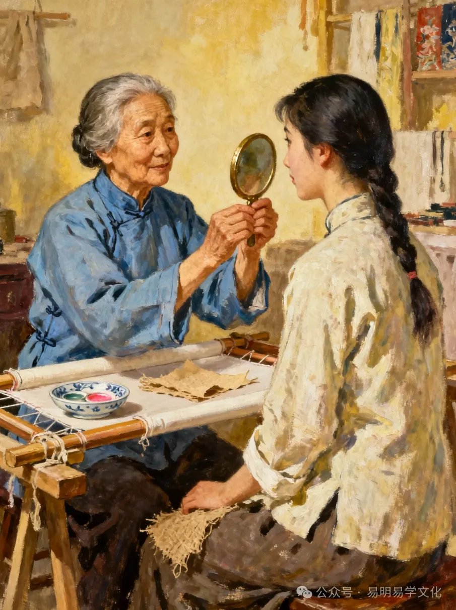 那年我十四,刚上初二,放了学就往外婆的新住处跑。她的草棚塌后,没再搭新的,搬去了村口秀莲婶的绣坊后院,占了半间堆绣线的小房。房里没摆木板,只放了张秀莲婶淘汰的绣绷桌,桌上除了竹篮和艾草,多了个瓷碟,里面盛着胭脂——不是给人涂的,是外婆看相时,用来在麻纸上点记面相特征的。