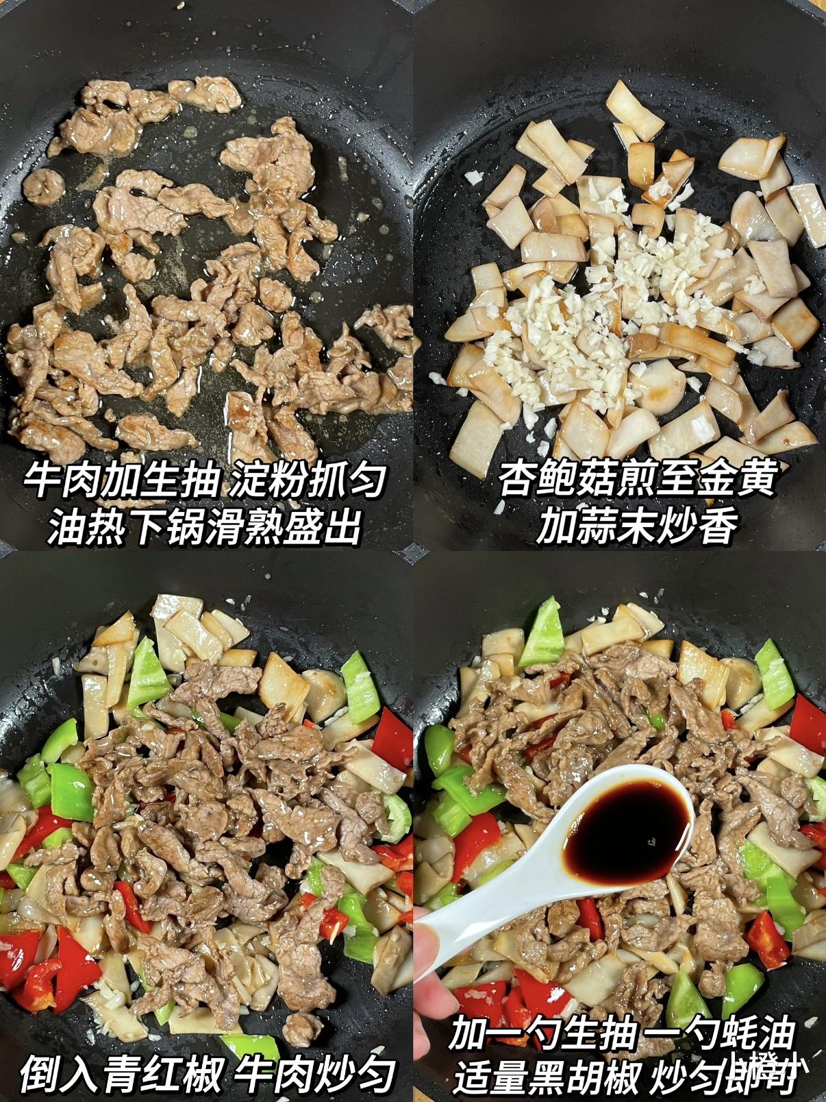 • 全程中大火:炒牛肉、煎杏鲍菇都要火候足,香气才出得来!