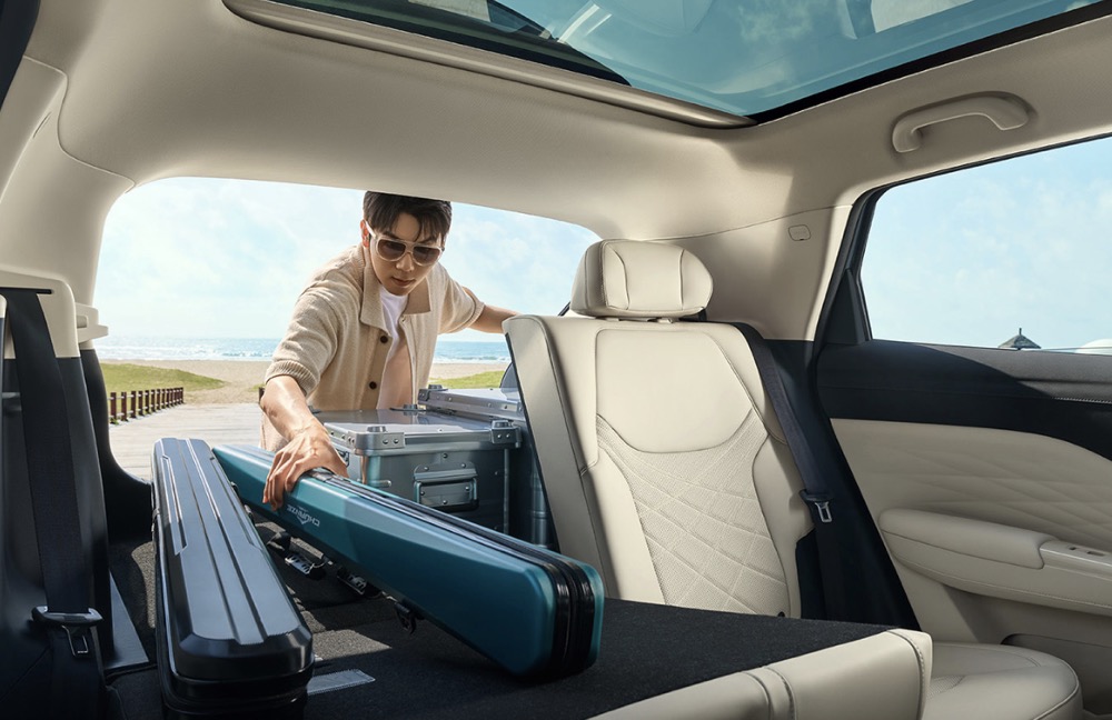 空间层面,极狐T1展现北汽蓝谷对用户需求的深度洞察。459L后备厢可容纳4个28寸行李箱+2个背包,后排座椅放倒后容积扩展至1352L,轻松应对露营装备、婴儿车等大件物品。车内设置21处储物空间,包括中控台下方悬浮式储物格、门板雨伞槽等细节设计,甚至在副驾仪表台下方预留“女王化妆镜”专属位置,将实用性渗透至每个用车场景。