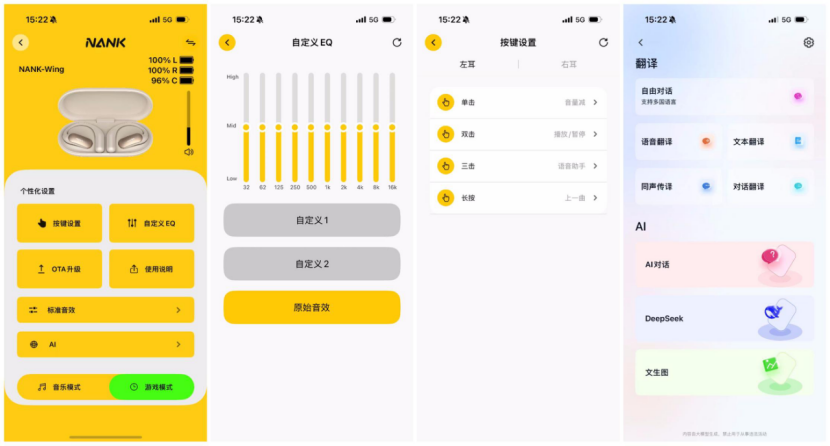 此外如果激活了Ai模块,可以实现更加强大的功能辅助,它集成了讯飞和DeepSeek等多模态AI引擎,支持语音翻译、AI对话、图像生成、深度搜索等数十项AI功能1,使耳机从单纯的音频播放设备转变为智能交互终端。翻译功能尤其实用,支持12种语言的实时互译。其他诸如AI聊天、AI辅助写代码、解题等也是非常契合特定用户需求的,非常方便。