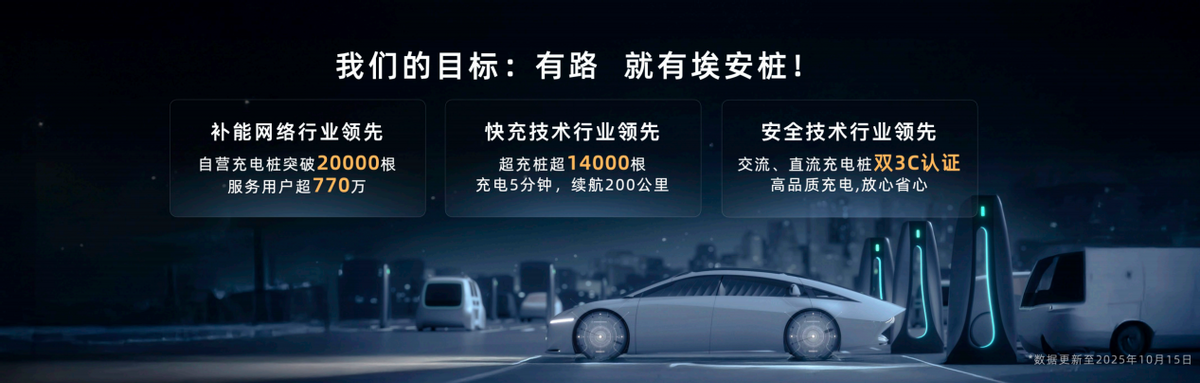“国民好车”的价值,不仅凝结于产品,更体现在全生命周期的服务体验中。针对用户的“补能焦虑”,广汽埃安(广汽能源)正构建全国最强的补能生态,截止至10月15日,其自营充电桩已突破2万根,1000V快充桩数量位居行业第一,并与超过137万根互联充电桩共同组成“快广近”网络,朝着“有路就有埃安桩”的目标稳步迈进。