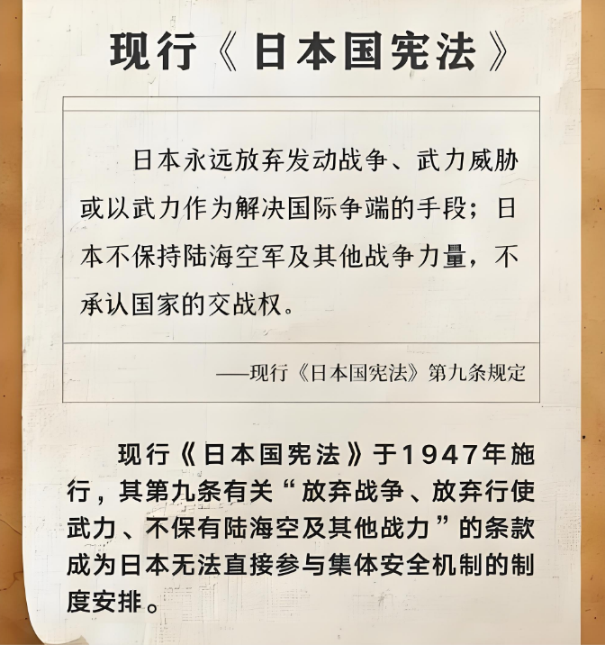 日本宪法第九条,被称为“和平宪法”。它规定日本“永远放弃以国权发动的战争、武力威胁或武力行使作为解决国际争端的手段”,“不保持陆海空军及其他战争力量”。