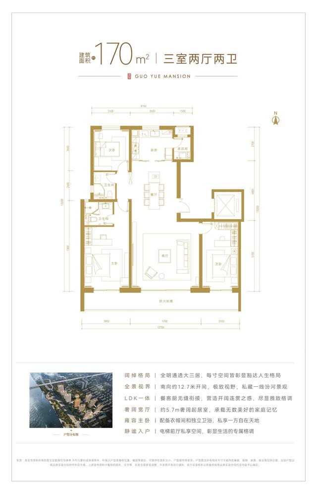 两梯两户的170平方米3居户型在6号楼,6#楼总建筑面积:22612.59平方米,层数32层,高度99.95米;