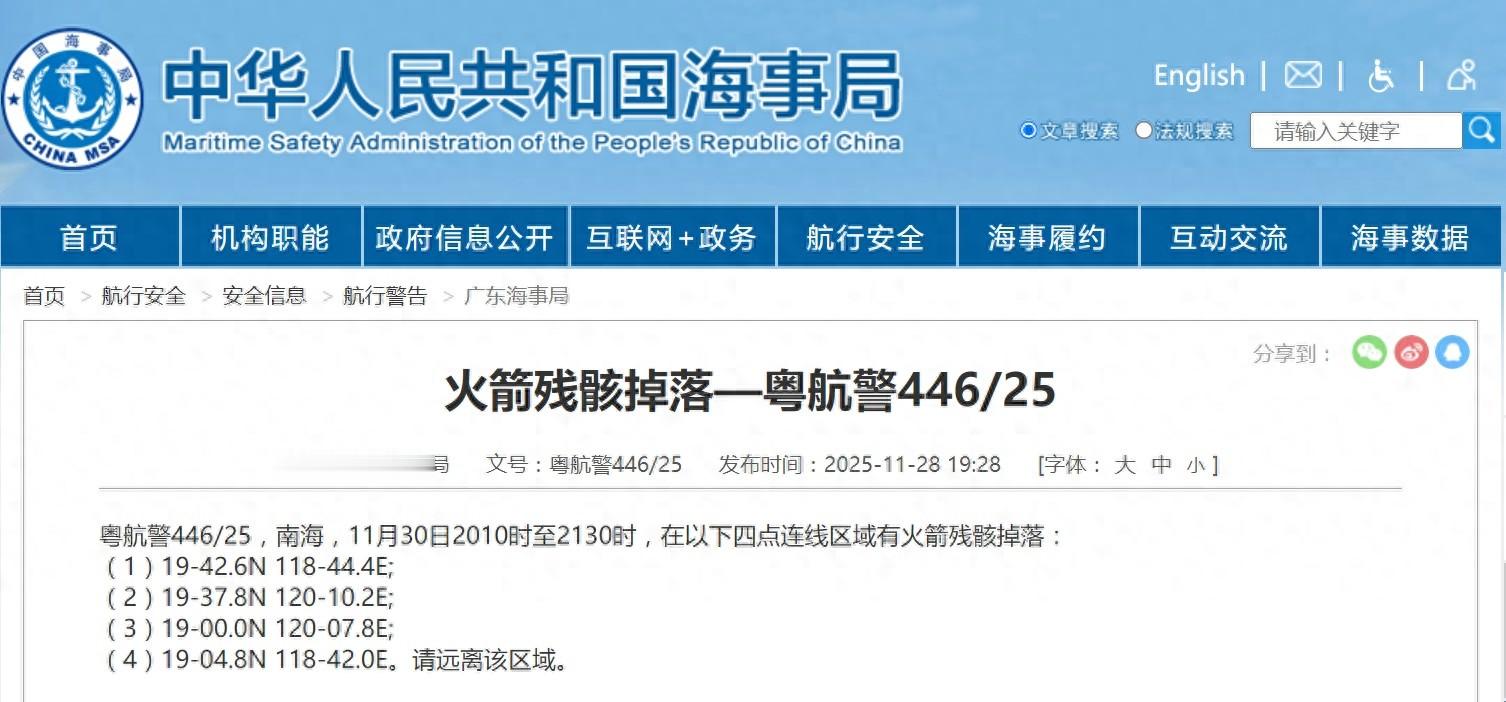据中国海事局网站消息,广东海事局发布航行警告,11月30日20点10分至21点30分,南海部分水域有火箭残骸掉落,请远离