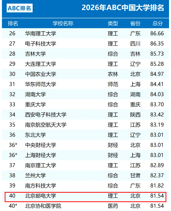 顺着榜单往下翻,北京邮电大学的名字让人直呼意外:81.54分、第40名,和北京协和医学院并列!你可能会愣一下:这所“信息黄埔”,怎么会在综合排名里待在这儿?但细想就会明白,这个位次其实像一面棱镜,刚好折射出它的特色与过去一年的扎实沉淀。