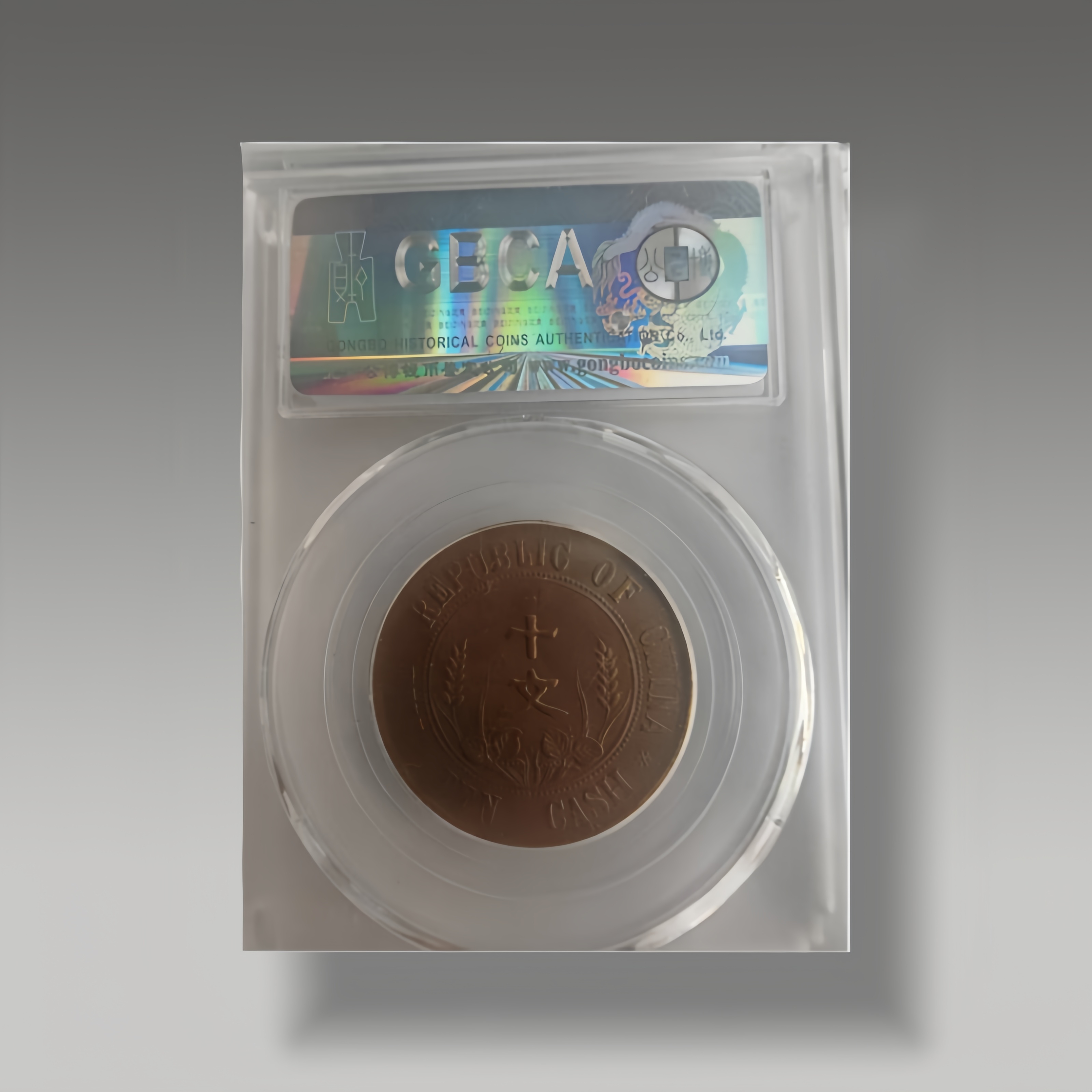 评级封装铜质十文币,正面镌双旗与纪年,背面饰嘉禾纹与币文。包浆温润,齿边规整,品相上乘