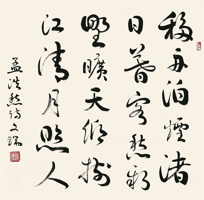 再看张文瑞的笔法,线条十分灵动,点画十分自然,入笔、行笔、收笔,或快、或慢、或收、或放、或开、或合、或疏、或密,无荒率之气,更无浮躁之感,那刚与柔的交替、动与静的转换、那方与圆的辉映、欹与正的结合,无不挥洒自如,又恰到好处。说其点,如高山坠石、鲲鹏击水、长虹饮涧……, 皆不能言其真;说其线,似屋漏痕、似锥画沙、似折钗股……,也不能道其妙,因为,一切都在情理之中,又常常出于意料之外,在情理之中的是法度,意料之外则给人一种意想不到的惊奇,很别致、也很高级。显然,那是张文瑞的独特风格,有别于传统,更有别于今人。