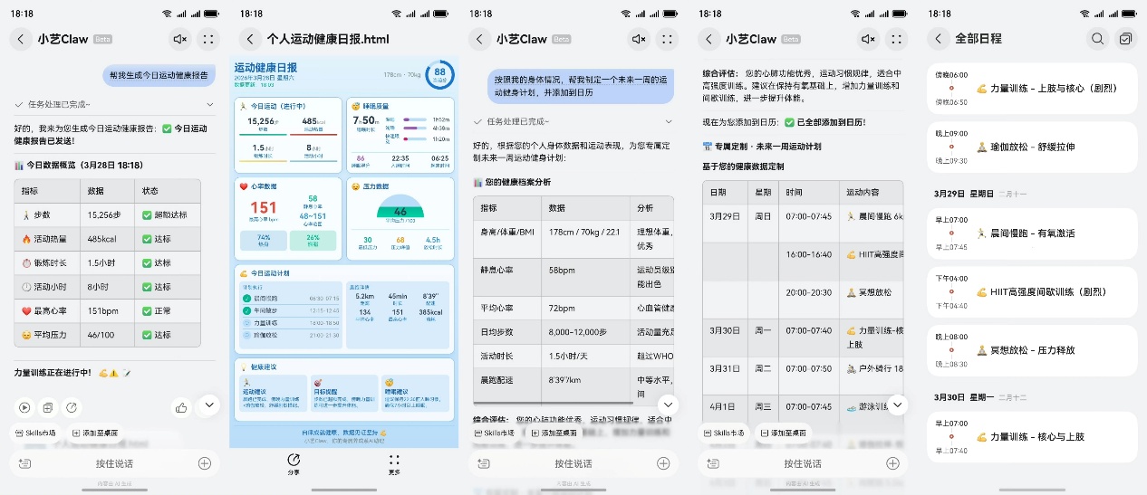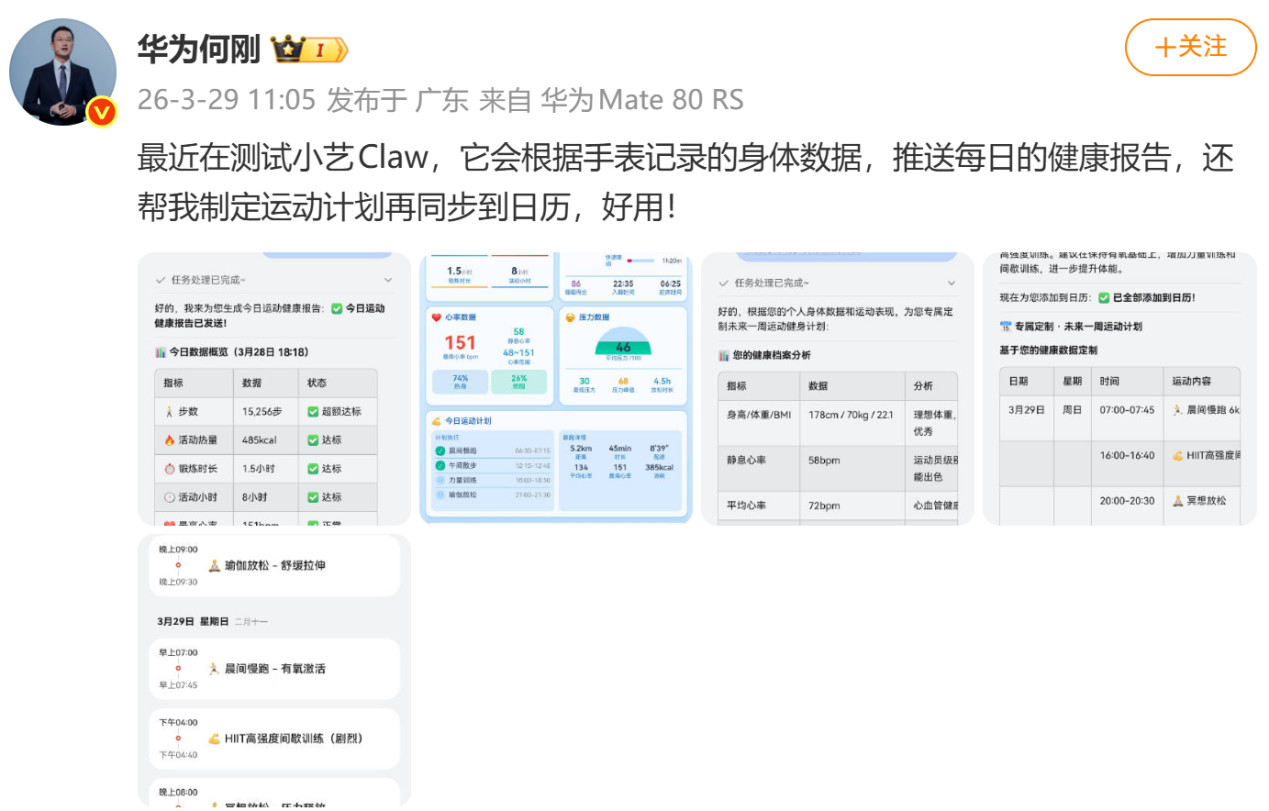 实际体验下来,我发现小艺Claw的能力真是让我大开眼界。就像何刚总在微博里分享的那样,只需一句话指令,小艺Claw就能自动调华为智能手表中的运动健康数据,还能进行规划,量身定制出专属的训练方案,并将训练安排添加到系统日历中。