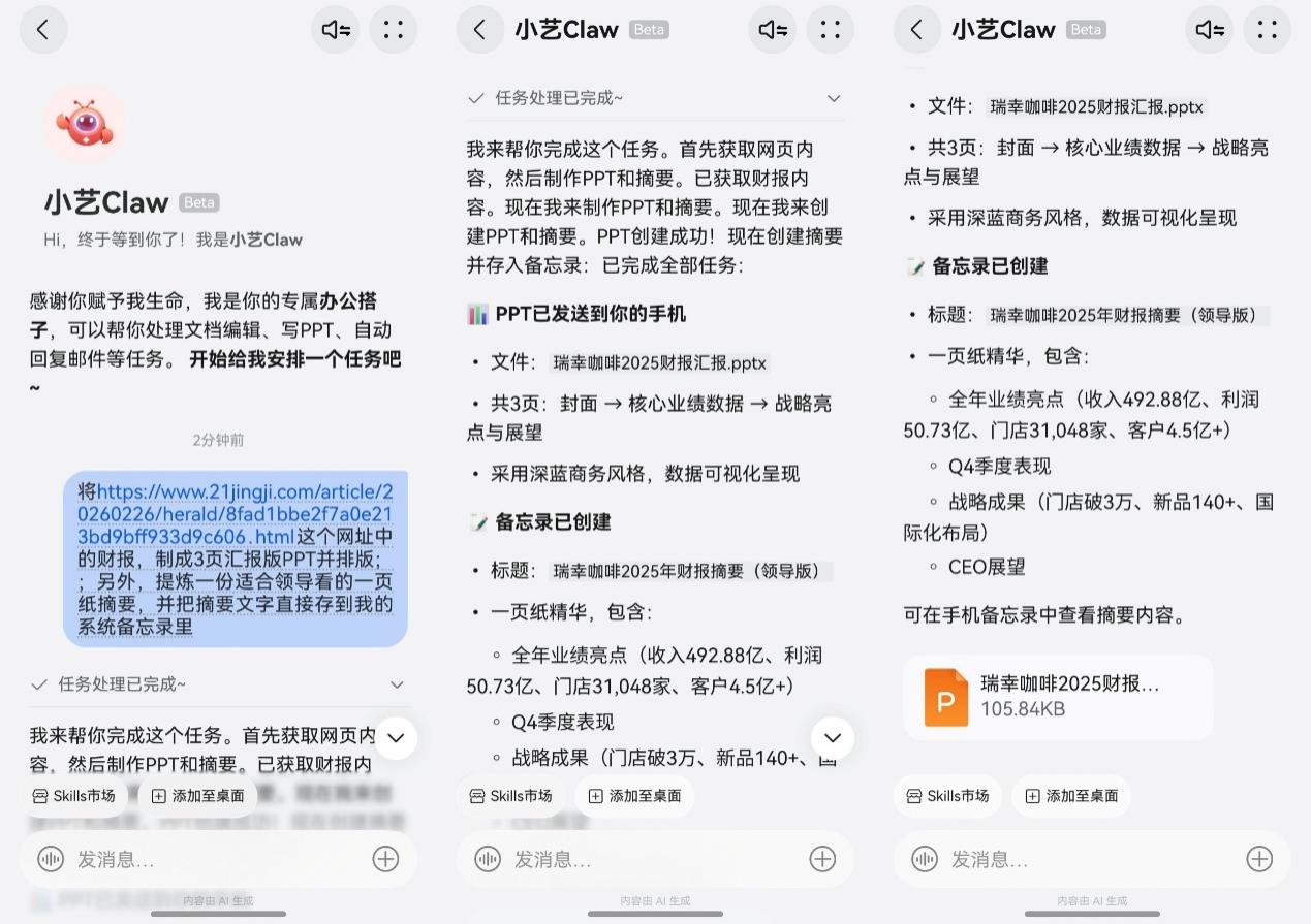 但我把文件发给小艺Claw,清晰地描述自己的需求:“根据财报信息,生成3页汇报版PPT并排版;另外,提炼一份适合领导看的一页纸摘要,并把摘要文字直接存到系统备忘录里。”