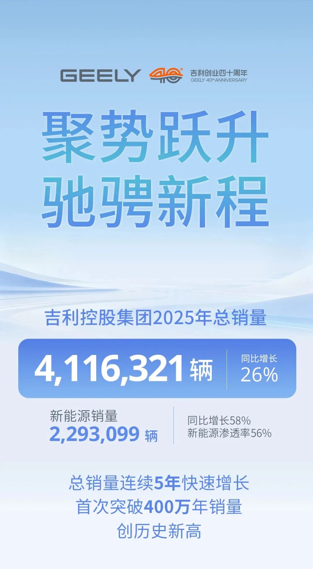 这一成绩得益于吉利控股集团2025年总销量同比增长26%,年销量首次突破400万辆,创下历史新高。
