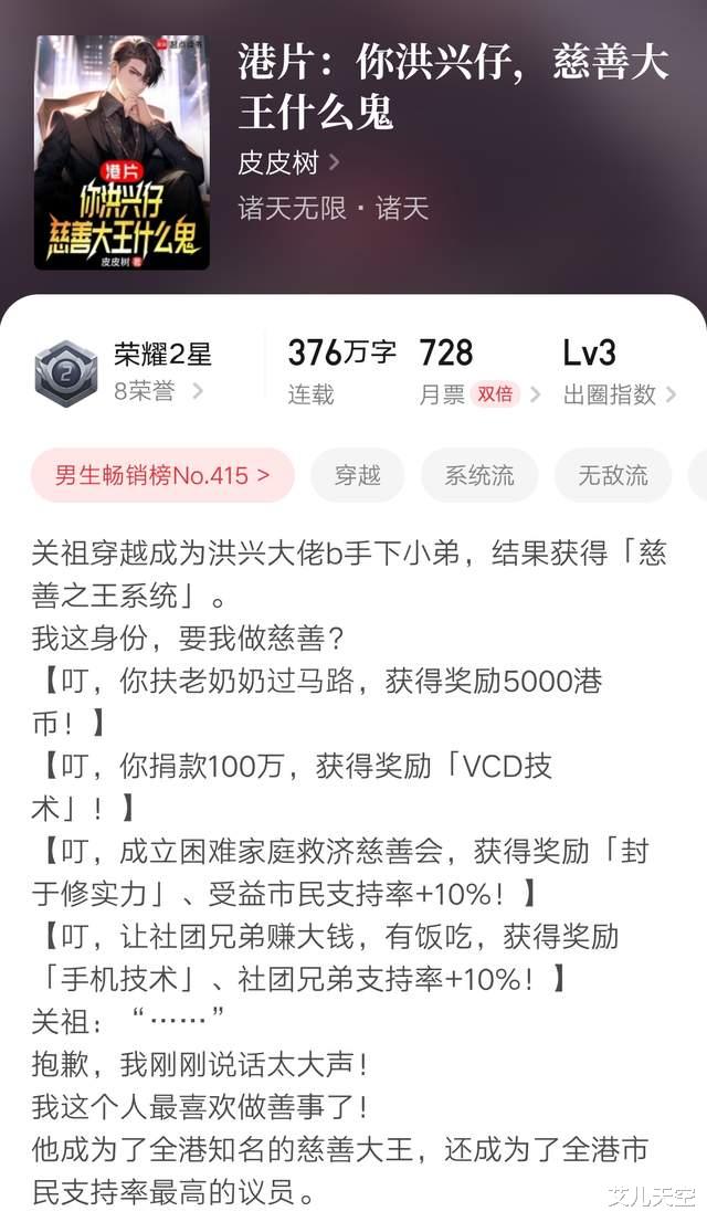 还是港综文类型,主角穿越洪兴大佬B的小弟,结果开启了一个慈善之王系统金手指,做好事就能获得各种奖励。