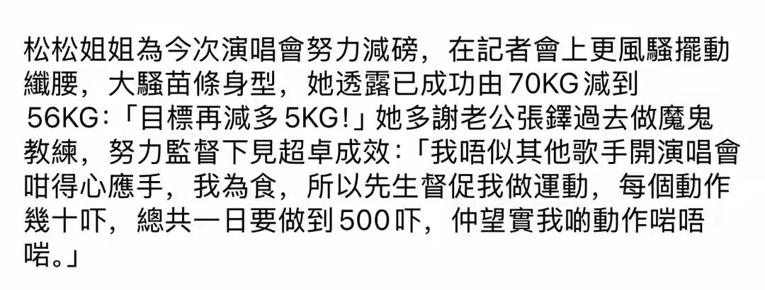 陈松伶表示,自己之所以减肥这么多,就是为了能有一个好的状态登台,她已经从原来的70公斤,减到了56公斤,不过这还不是她的理想体重,她打算再加把劲儿,减掉5公斤。