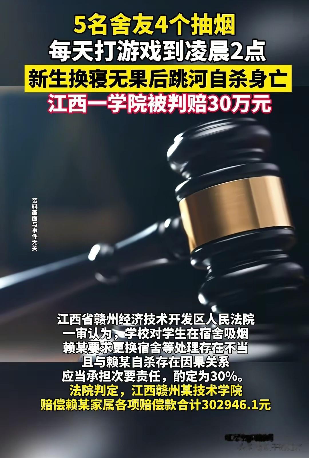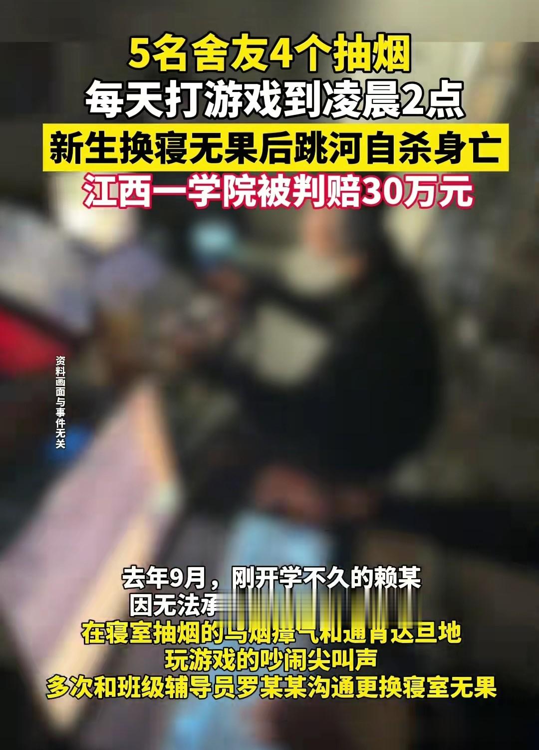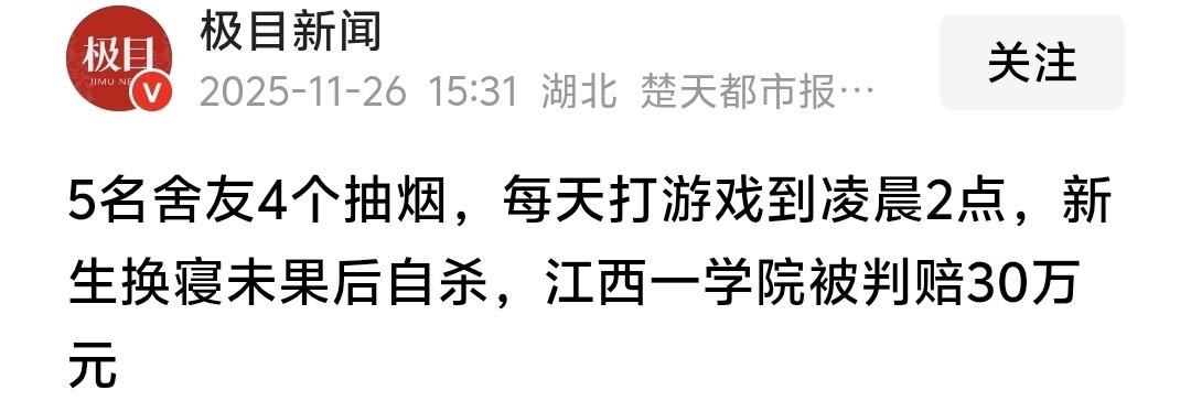 11.26日消息,江西赣州某高校“一男子申请换宿舍被拒后轻生,5名舍友四个抽烟+熬夜打游戏”,法院判了