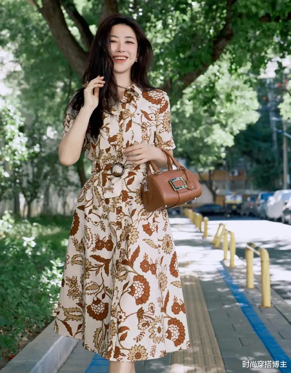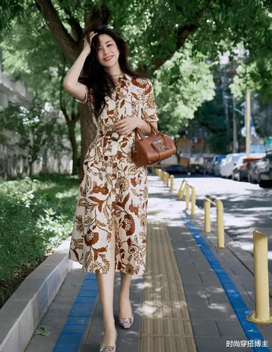 并且碎花图案本身就给人一种温柔、浪漫的感觉,砖红色则增添了一丝优雅和成熟,整体穿起来让人看起来温柔又不失气质,这大概就是朱珠为什么40岁了还能给人一种风情万种韵味的原因吧?