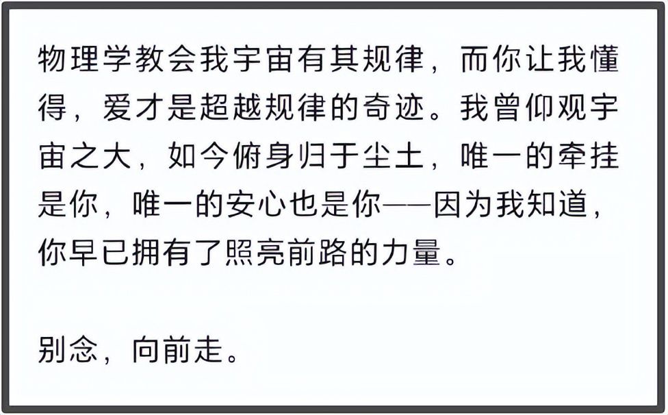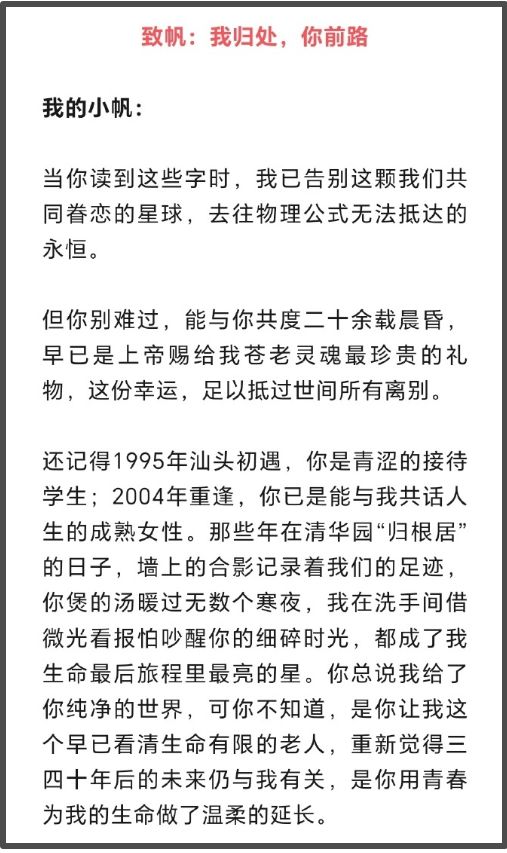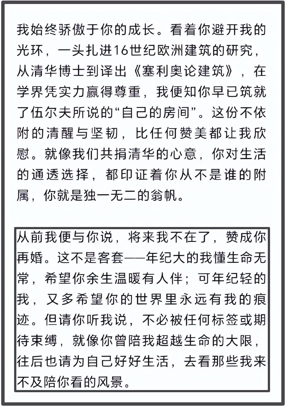 先生说,只希望今后翁帆不要因为对他的思念,而影响她的生活和判断,望她向前走,别回头。