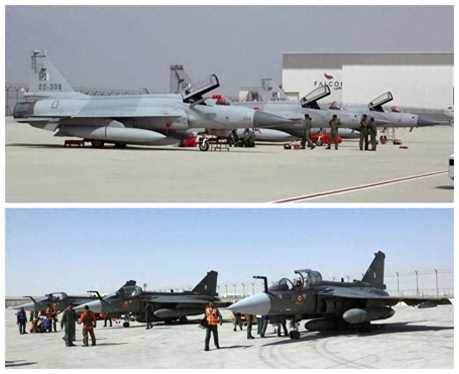 三架印度国产LCA“光辉”轻型战斗机与三架中巴联合研制的JF-17“枭龙”战机在停机坪上遥相对峙,仿佛南亚天空下的宿命对决。