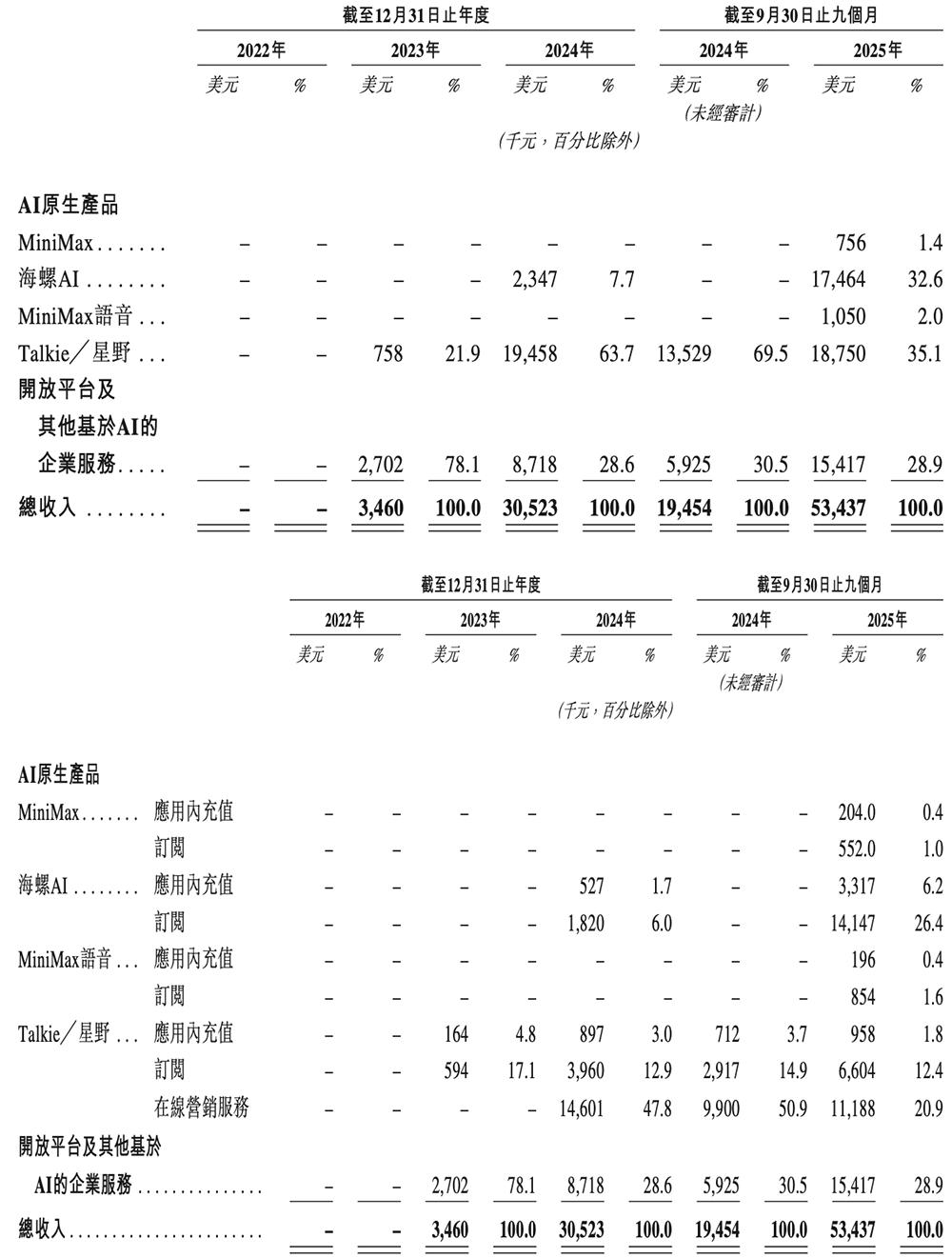 2023年、2024年、2025年1-9月,MiniMax收入分别为346万美元、3052万美元、5344万美元。