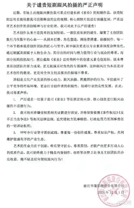 12月1日,华策影视针对市场上出现的多部短剧系统性抄袭其未播长剧《家业》的行为,发表了严正声明。