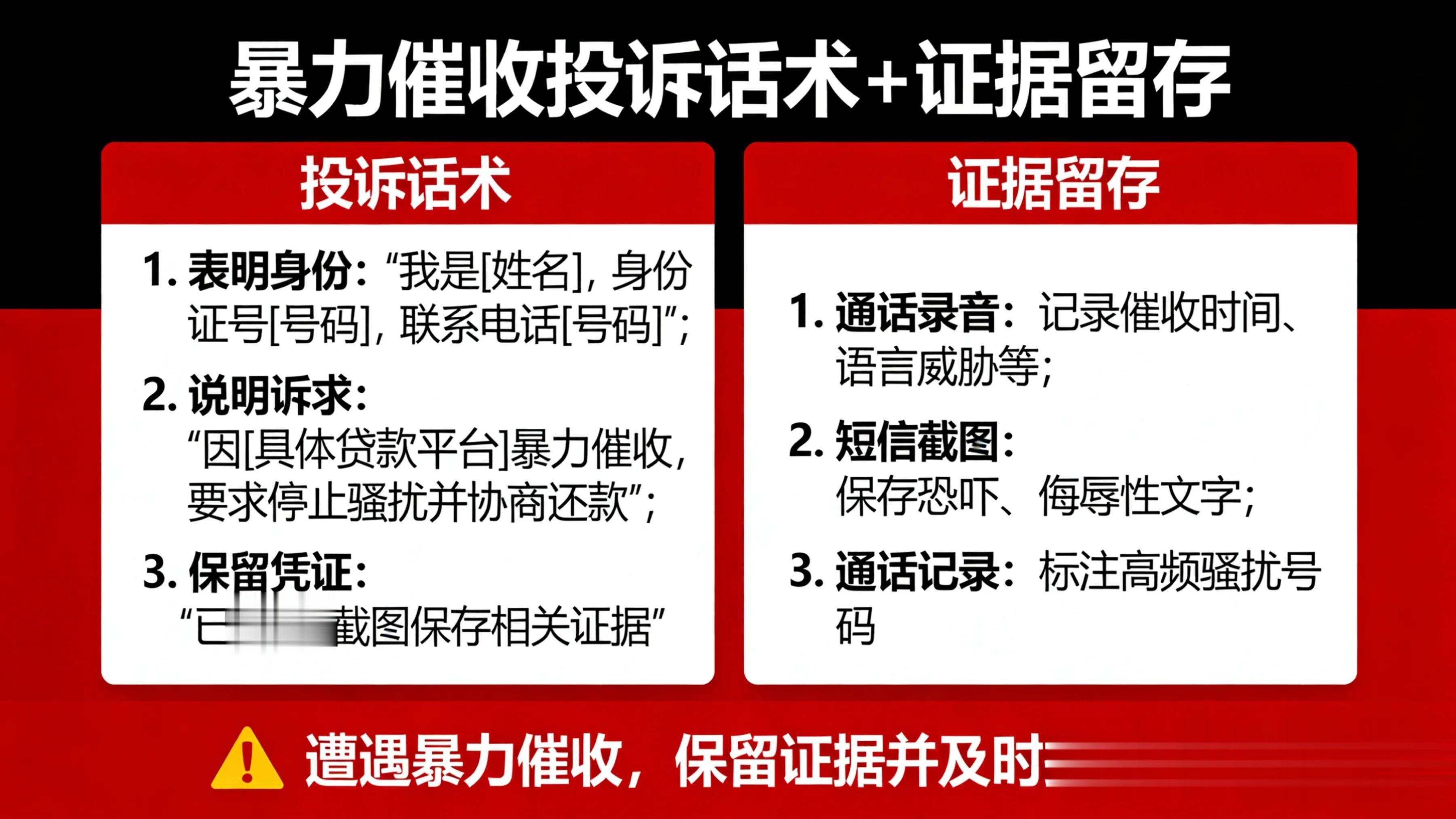 如果你正被催收上门威胁,或家人被骚扰,别慌!评论区扣“维权”,我发你《暴力催收投诉话术模板》和《证据留存指南》,手把手教你保护自己和家人!关注我,下期手把手教你:信用卡逾期怎么谈停息分期,最长分60期!觉得有用,一定要转发给身边正在逾期的朋友,别让他们再被催收的恐吓话术骗了!