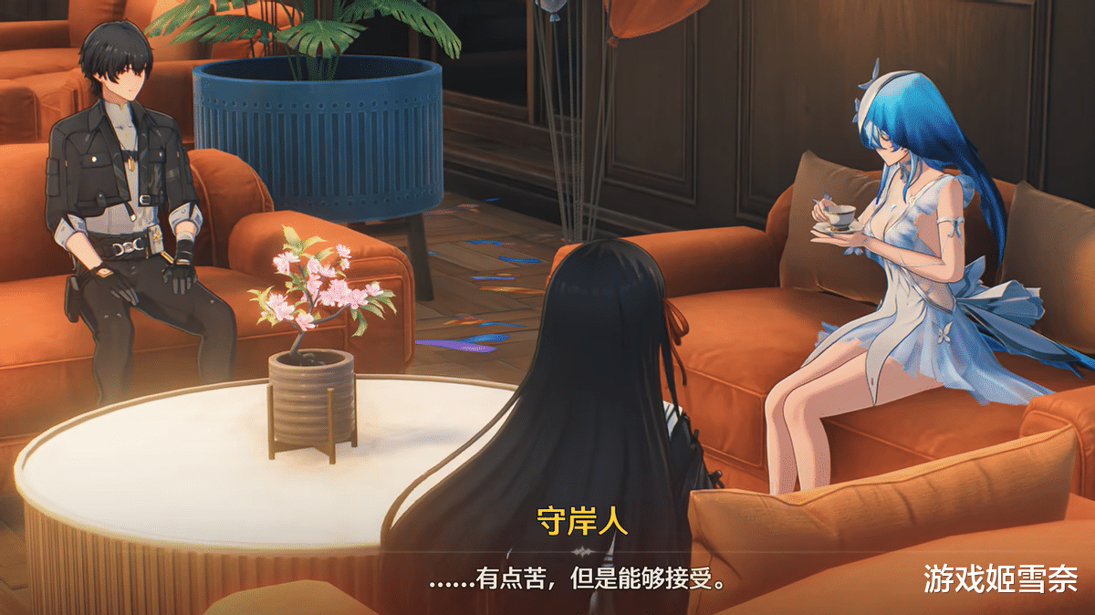 然后守岸人说邀请名单里只有安可,自己和卜灵能来,卜灵要进池子肯定要多露面,安可则是被泰提斯系统留了作业,虽然千咲帮腔说自己辅导了数学,可是这里面真的没有岸宝的小巧思吗?毕竟自家小迷妹椿都被岸宝支走去工作了,椿来的时候还说不知道漂子被裂隙吃了,也就是守岸人没跟他说,哎呀,老婆也有自己的小心思呢,也难怪刚进来看见千咲脸垮的那么难看,耽误自己跟漂子贴贴,而作为大老婆又要端庄大度,没办法像椿一样说什么明显的不高兴的话,快给岸宝气成红蝴蝶了。