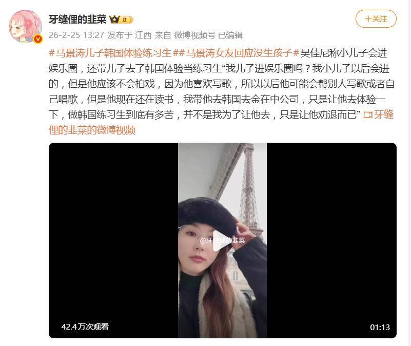 马景涛前妻吴佳尼在直播里的一番话,让围观群众有点摸不着头脑。原来,她带着16岁的小儿子马世心跑去韩国娱乐公司体验生活,不是为了铺星路,反而是为了“劝退”儿子的娱乐圈念头——这波反向操作,瞬间成了热议焦点。