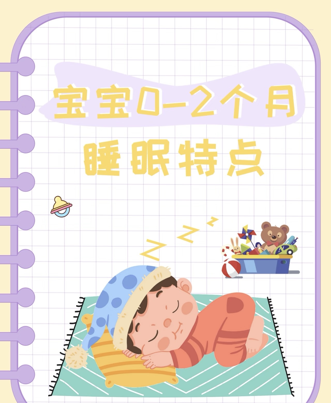 这个月龄的宝宝是个“小睡神”,每天要睡上16到20个小时。他们的睡眠模式是碎片化的,睡一两个小时就会醒,这是正常的,别试图强行延长他们的睡眠时间。为宝宝创造一个安静、舒适、温度适宜(大约24-26℃)的睡眠环境非常重要。建议让宝宝仰卧睡觉,这是最安全的姿势,能有效降低婴儿猝死综合征的风险。床上不要放枕头、毛绒玩具或太松软的被子,避免窒息隐患。白天可以让房间有些自然光和日常声响,晚上则调暗灯光、保持安静,慢慢帮助他建立白天和黑夜的概念。