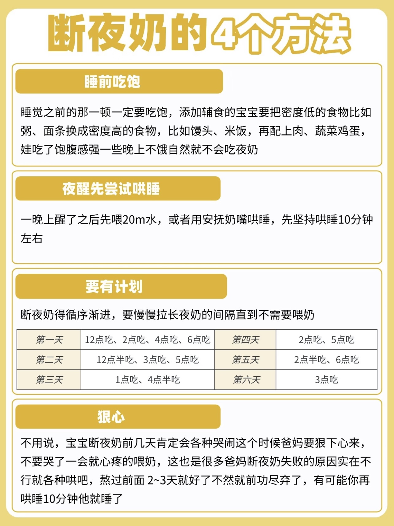 断夜奶可以调整白天喂养,填饱“小肚子”,6月龄引入高铁米粉,7月龄后增加肉泥、蔬菜泥,8月龄尝试“手指食物”(如蒸南瓜条),让宝宝体验自主进食的乐趣;白天每3-4小时喂一次奶,睡前1小时加一顿“饱腹餐”(如150ml配方奶+半碗米粉),减少夜间饥饿感;固定每天起床、午睡、晚上睡觉时间(如7点起床、12点午睡、8点入睡),帮助宝宝建立生物钟。或者夜间安抚,第1-3天:宝宝夜醒时,先不喂奶,用“轻拍+哼歌”安抚(如拍背节奏与心跳同步,哼《摇篮曲》);若哭闹加剧,用温水蘸棉柔巾轻擦脸颊(模拟哺乳时的触感);第4-6天:若安抚无效,改用“延迟响应法”(如第一次哭等5分钟,第二次等10分钟,逐渐延长间隔),同时用安抚奶嘴或安抚巾转移注意力;第7天后:多数宝宝能适应新模式,若仍偶尔夜醒,可给予少量水(用勺子喂,避免奶瓶依赖)。宝宝断夜奶全家统一战线,不能心软,夜间安抚由爸爸主导(妈妈身上有奶味,容易刺激宝宝索奶);睡前将母乳吸出存放,夜间若需补奶,由爸爸用奶瓶喂(减少宝宝对母乳的直接联想);白天多对宝宝说:“宝宝长大了,晚上不用吃奶啦,像小老虎一样勇敢!”强化心理建设。