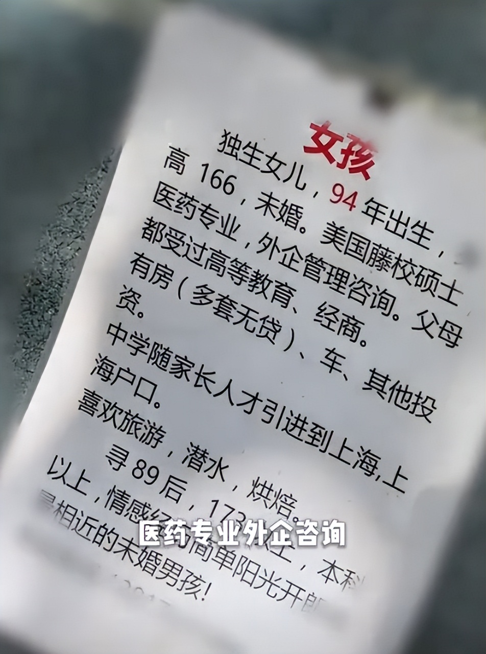 俩人边走边看贴满的资料卡,其中一张94年女生的信息让田朴珺停了下来:身高 1 米 66,未婚,美国藤校硕士,在知名外企做咨询,条件看着特别优秀。