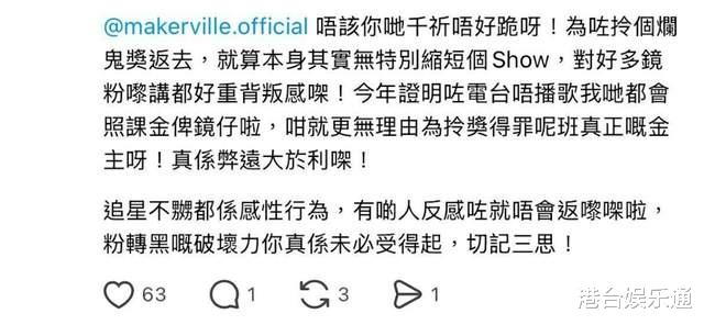 另一位粉丝则警告道:“ViuTV绝对不能让步!为了拿个破奖回去,就算当天没有缩短演唱会时间,对镜粉来说也是很严重的背叛。这次已经证明了,就算电台不播MIRROR歌,我们照样氪金支持MIRROR,所以更没有理由为了拿奖,得罪我们这群真正的金主!追星向来都是感性的行为,有些人如果反感了,就脱粉不会回来了,粉转黑的破坏力你们真的承受不起,请三思。”