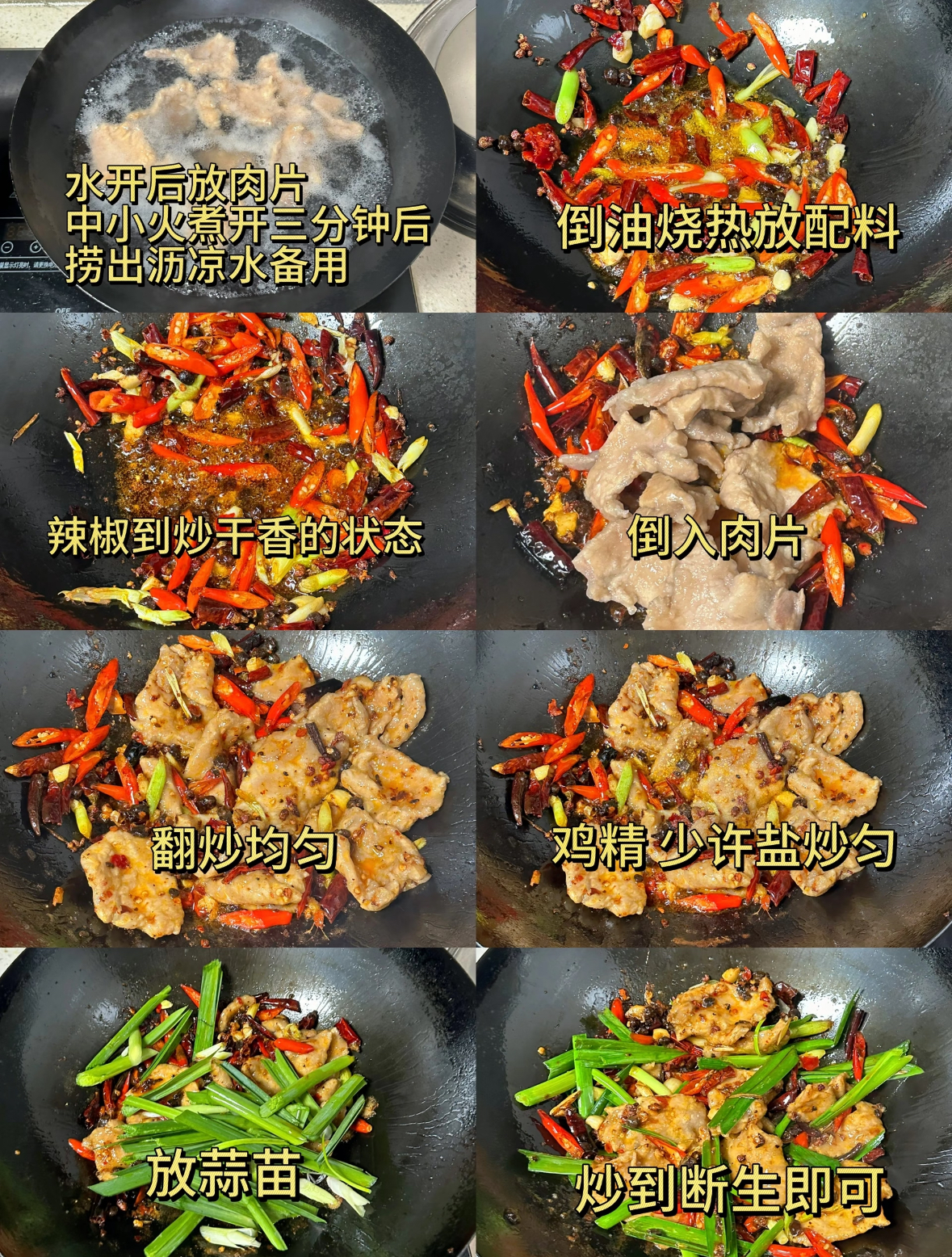 但接下来的步骤就不一样了。烧一锅水,水要多一点,能没过肉片。等水完全烧开,沸腾起来的时候,把腌好的肉片一片一片地放进锅里,不要一下子全倒进去,容易粘成一坨。用筷子轻轻把肉片划散,让它们在水里自由舒展。这时候你会看到肉片迅速变色,从粉红变成灰白。转中小火,保持水面微微冒泡但不大滚的状态,煮上三分钟。为什么要煮?因为直接炒肉片,高温下水分流失很快,容易变老。而用温水慢慢煮,肉片在温和的环境里熟透,水分被锁在里面,出来之后特别嫩滑。三分钟一到,用漏勺把肉片捞出来,马上放进凉水里过一下,沥干水分备用。过凉水能让肉片表面收紧,口感更弹,还能洗掉表面的浮沫。