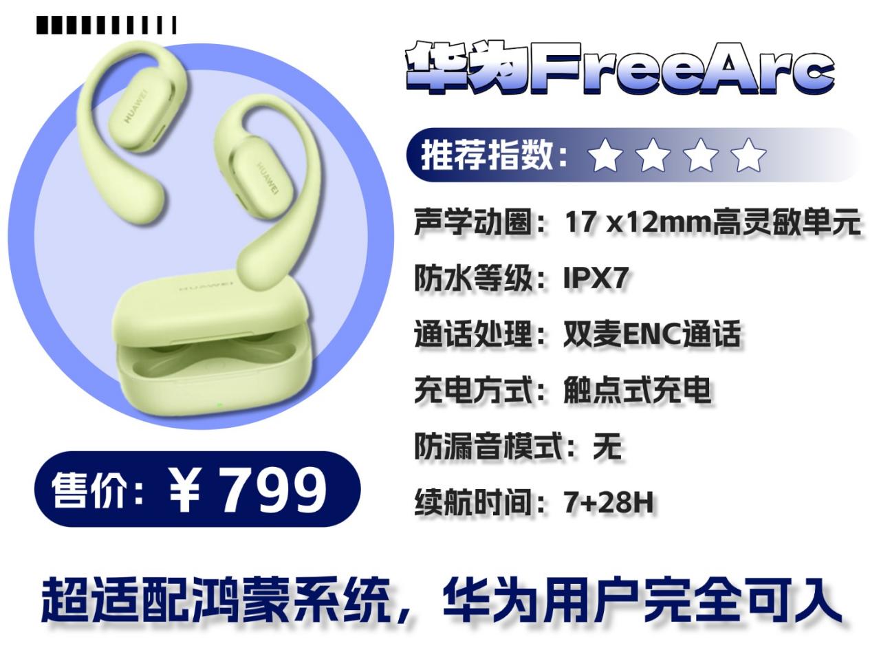 华为 FreeArc售价:799元推荐度:★★★★推荐理由:超适配华为设备,多设备切换还特别顺滑,日常用起来能省不少事,完全不用在设备间反复断开重连。