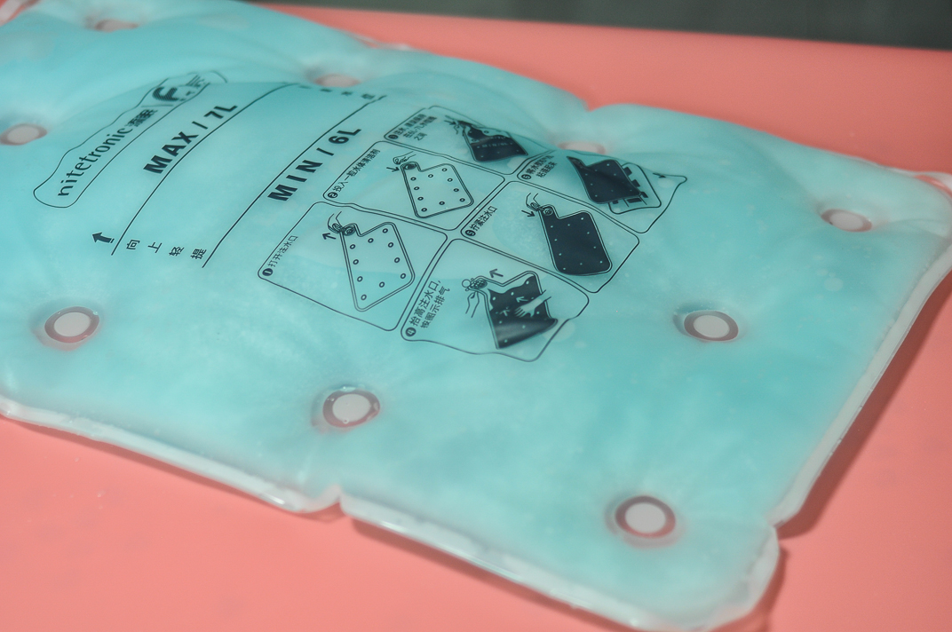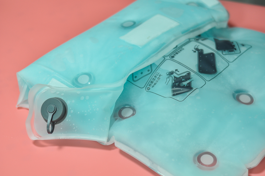 这款枕头的主色调是淡淡的海水蓝,水体和枕套都是这个颜色。枕体边缘呈圆弧形,配上冰丝和石墨烯拼接的枕套,看着就有在海边度假的惬意感觉。水气双层的枕体线条流畅,褶形水枕层表面的波纹纹路清晰可见,分段气枕层侧面有个不显眼的充气阀门,整体样子简约又不失设计感,放在卧室里更像个实用的家居装饰。