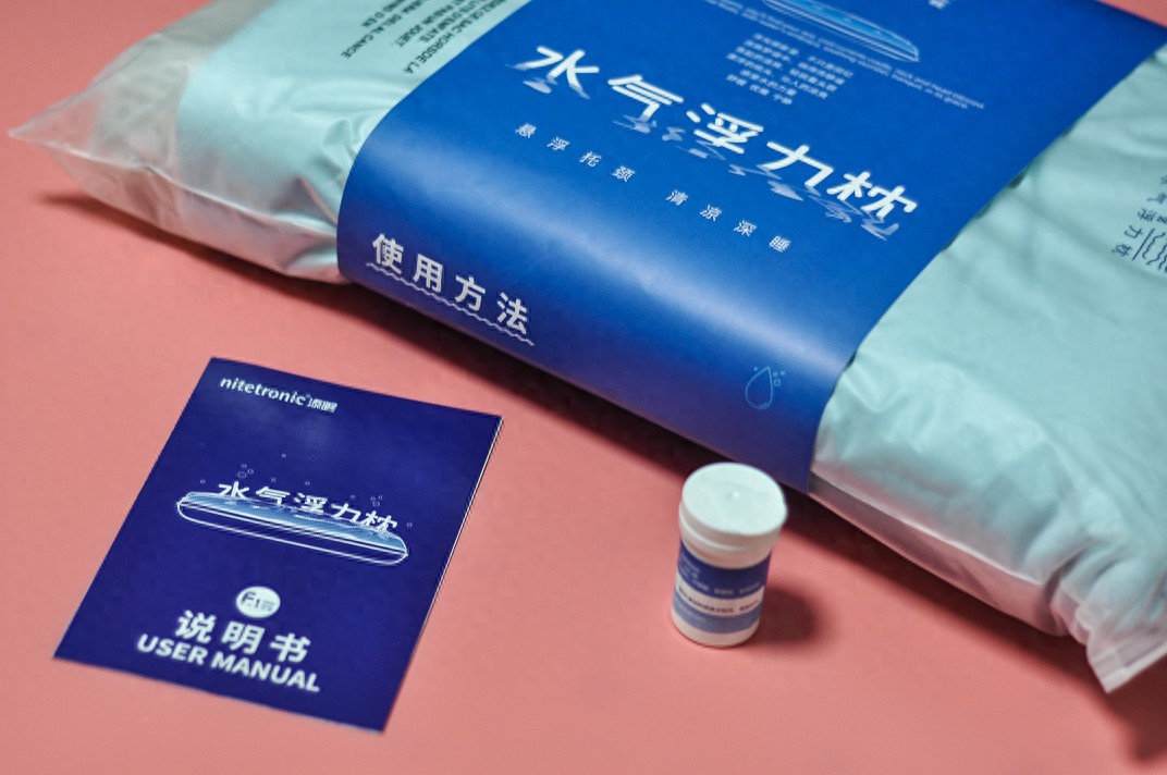 包装采用简约礼盒样式,正面的点状波浪纹突出了水气浮力枕的特色。背面详细标注了产品功能特点和厂商信息,凉爽舒适、流体力学、柔软解压、枕高可调这些卖点都让人满怀期待。包装侧面留有易拉条,拉开后即可打开盒盖,里面除了水气浮力枕和枕套外,还有详细的说明书、合格证以及水体清洁剂片。盒子内侧淡淡的蓝色,进一步烘托出产品的清凉氛围。
