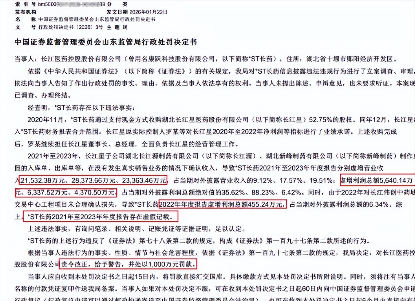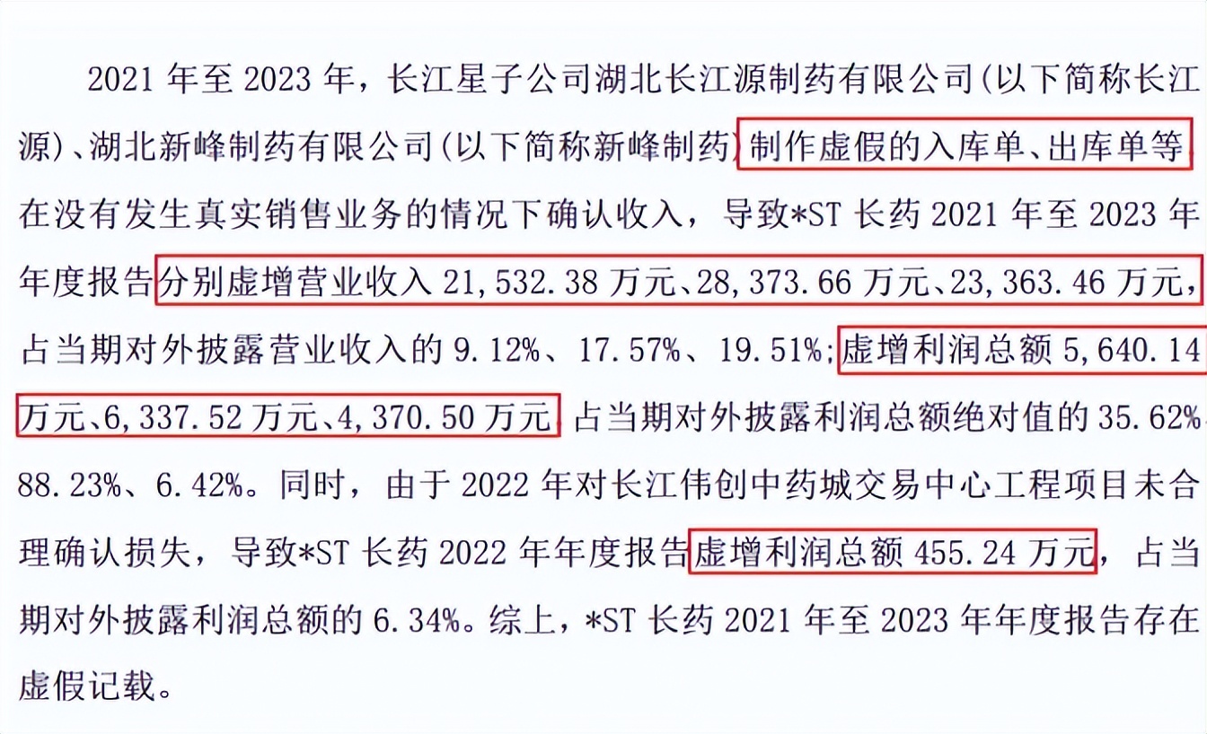 根据公开资料,长江医药2022年对长江伟创中药城交易中心工程项目,未合理确认损失,额外虚增利润总额455.24万元。