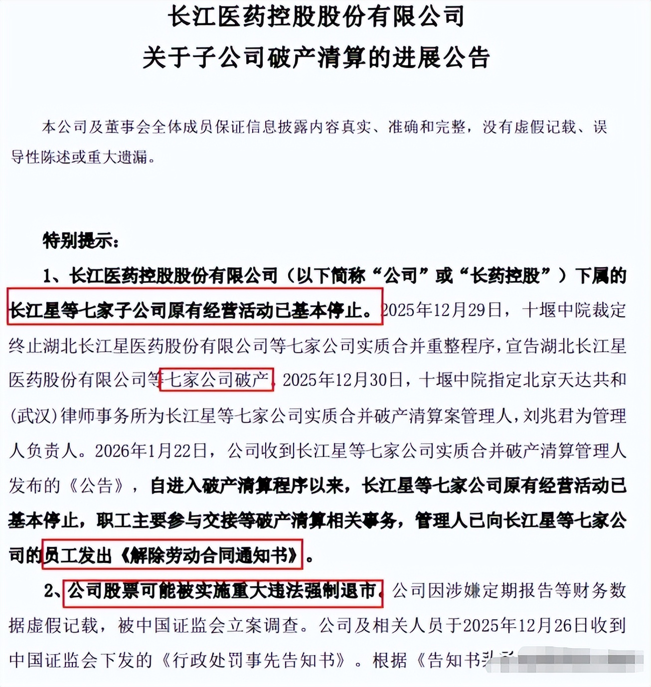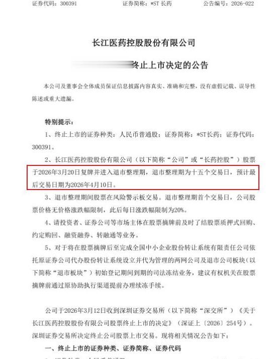 而且从后果来看,三者也高度相似,康美、康得新都已退市,长江医药也已于2026年3月20日进入退市整理期,大概率会步它们的后尘,面临退市结局。