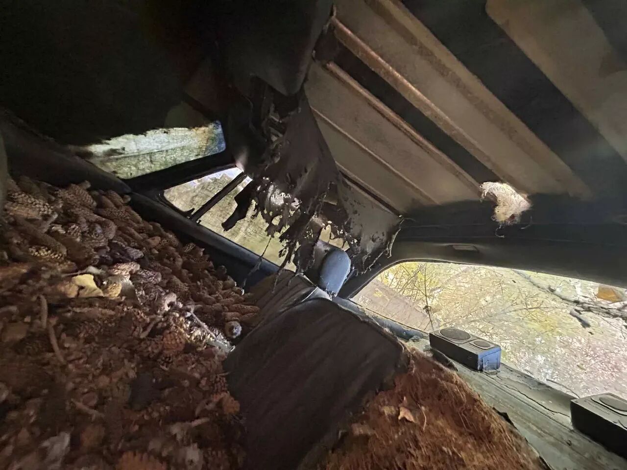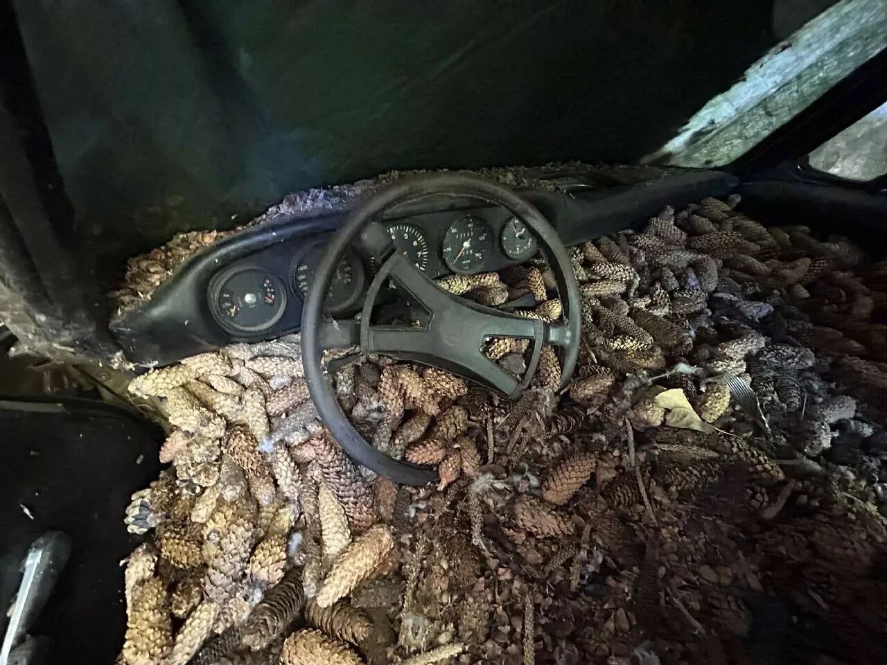 31年间,四季更迭,松针与松果层层堆积,最终将车身半埋其中;风雨侵蚀让内饰暴露在外,松鼠也将这里当作了天然的储粮库,在车内囤积食物。