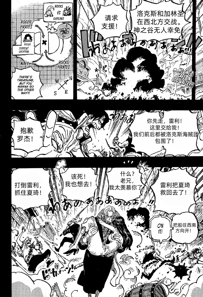 本话开始,雷利救走夏琦之后,遭到了洛克斯海贼团的人攻击,不过罗杰等人也在帮助雷利逃走!