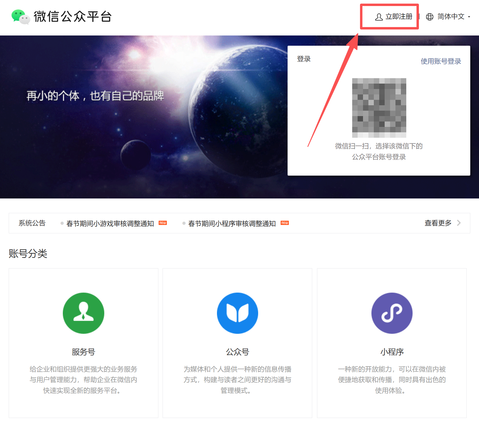 1、打开微信公众号官网:https://mp.weixin.qq.com/,点击右上角的「立即注册」