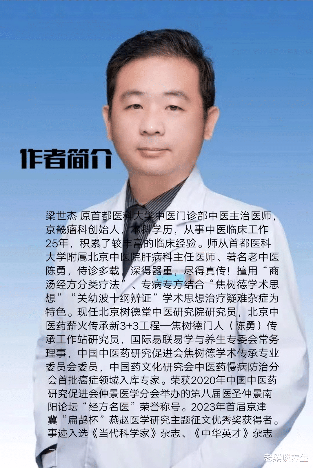 作者简介:梁世杰 原首都医科大学中医门诊部中医主治医师,京畿瘤科创始人,本科学历,从事中医临床工作25年,积累了较丰富的临床经验。师从首都医科大学附属北京中医院肝病科主任医师、著名老中医陈勇,侍诊多载,深得器重,尽得真传!擅用“商汤经方分类疗法”、专病专方结合“焦树德学术思想”“关幼波十纲辨证”学术思想治疗疑难杂症为特色。现任北京树德堂中医研究院研究员,北京中医药薪火传承新3+3工程—焦树德门人(陈勇)传承工作站研究员,国际易联易学与养生专委会常务理事,中国中医药研究促进会焦树德学术传承专业委员会委员,中国药文化研究会中医药慢病防治分会首批癌症领域入库专家。荣获2020年中国中医药研究促进会仲景医学分会举办的第八届医圣仲景南阳论坛“经方名医”荣誉称号。2023年首届京津冀“扁鹊杯”燕赵医学研究主题征文优秀奖获得者。事迹入选《当代科学家》杂志、《中华英才》杂志。