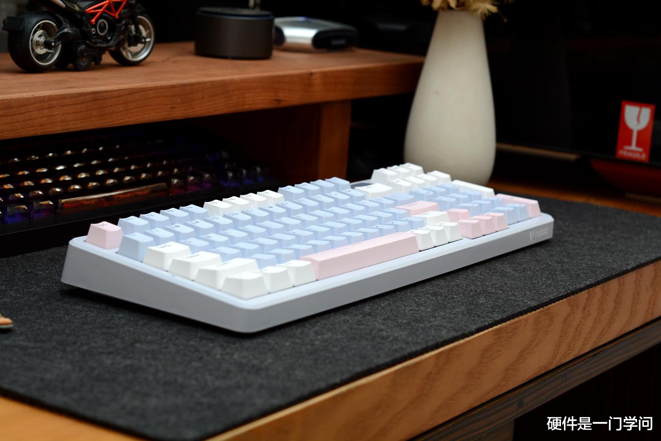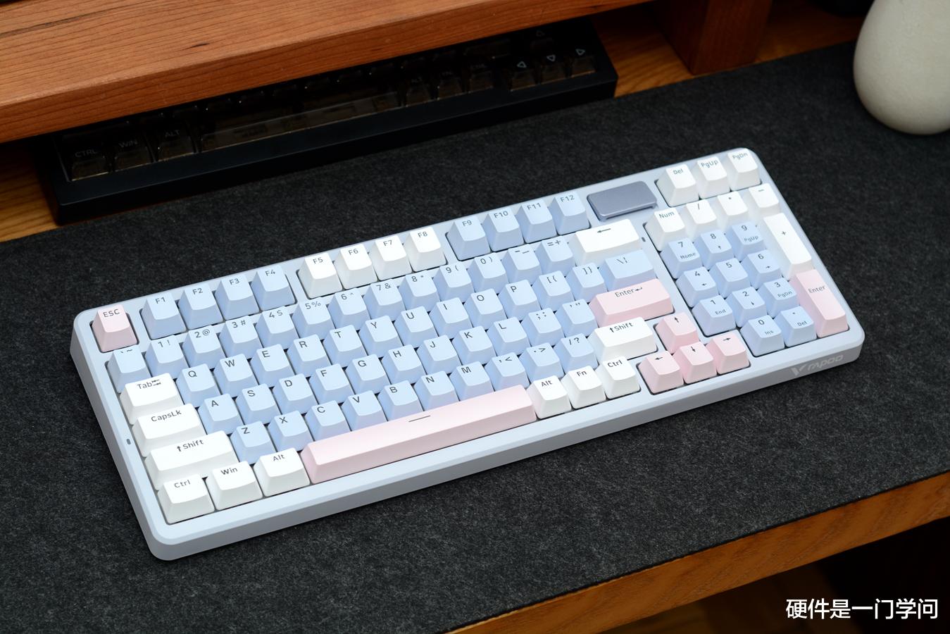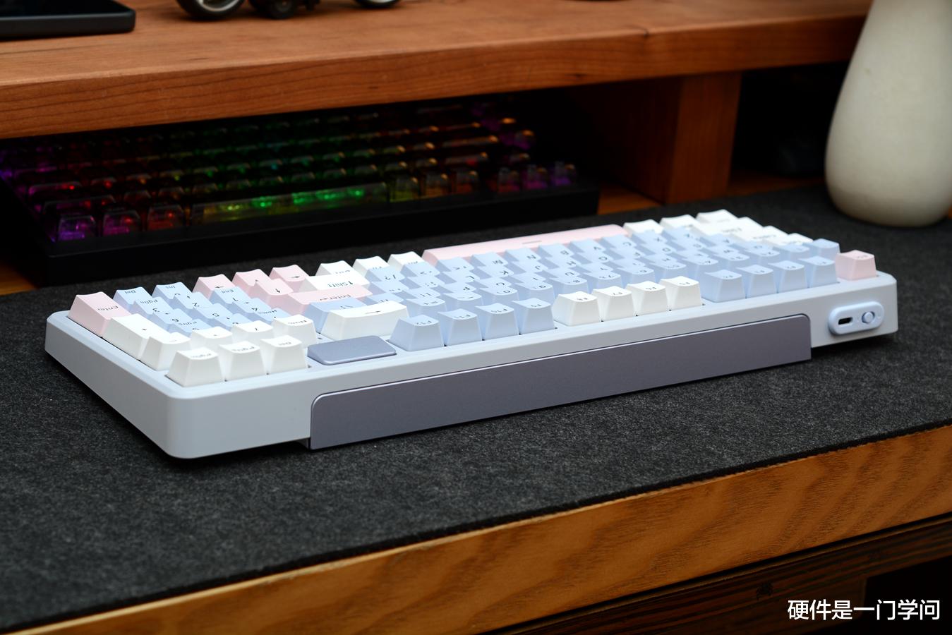 V700DIY-98采用98配列,由于右上角无线接收器收纳仓占了一格,实际是97个按键。莫奈仙踪,采用粉白蓝撞色,给人一种夏日小清新的感觉。