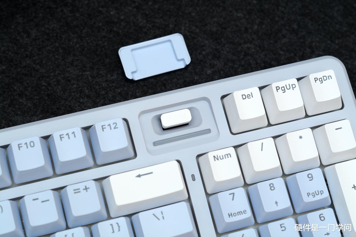 右上角的时空幻境仓,实际上是无线接收器的收纳仓,磁吸设计,配有条形灯,下方的Num数字键也配了一枚指示灯。由于时空幻境仓的布局,DEL向右偏了一格,对于习惯了老98布局的用户来说,需要适应一下。我个人建议将DEL键左移到F12旁边,时空幻境仓放在DEL键和PgUp键中间,右手操作时移动幅度会小很多。