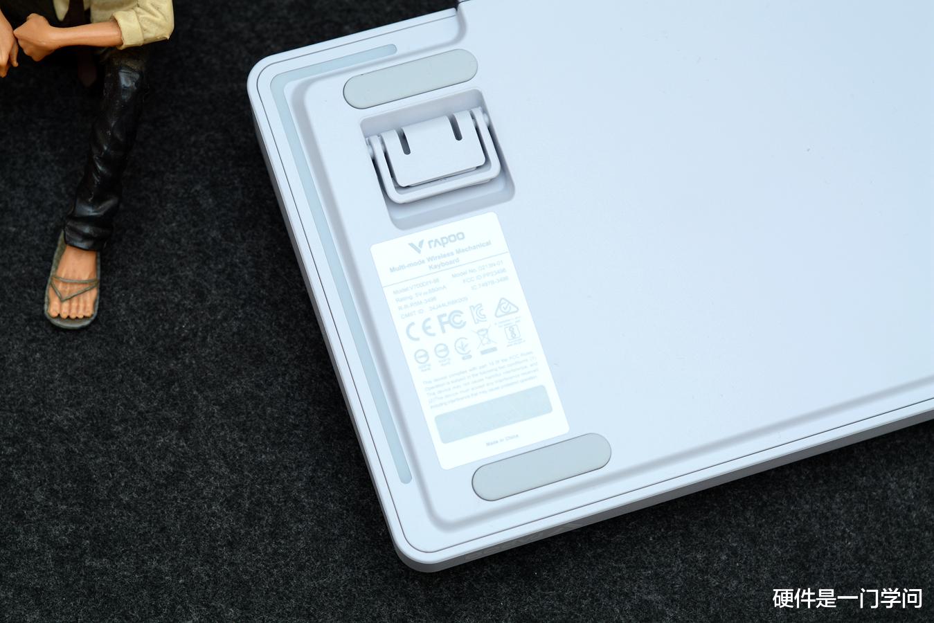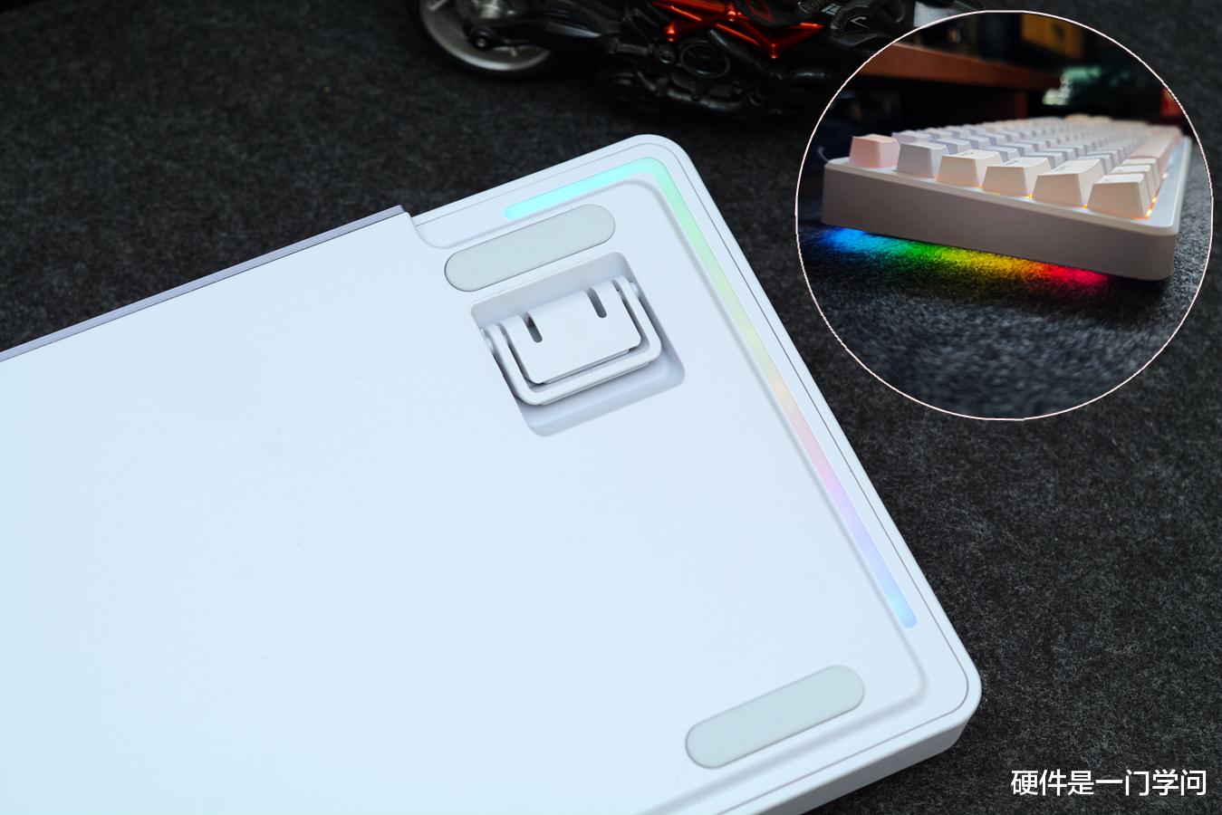 键盘底部配备了四块硅胶脚垫,高低二段式支撑,以及两个L型RGB灯条。
