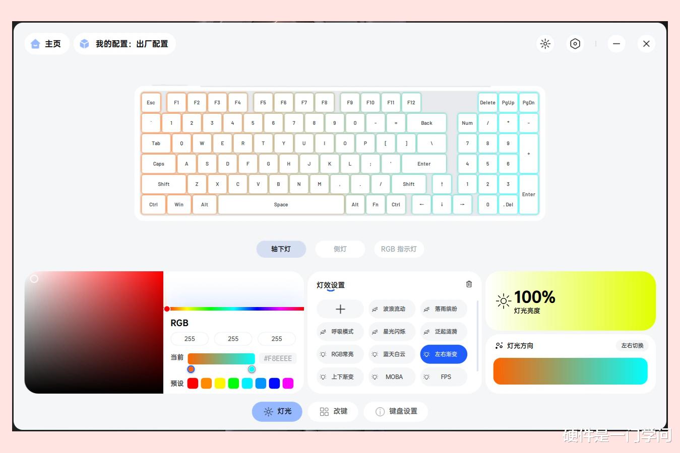 灯光板块,可以分别对轴下灯、侧灯、RGB指示灯进行设置,轴下灯有波浪流动、落雨缤纷灯18种灯效,个人觉得左右渐变、上下渐变默认色彩跟莫奈仙踪比较搭配。